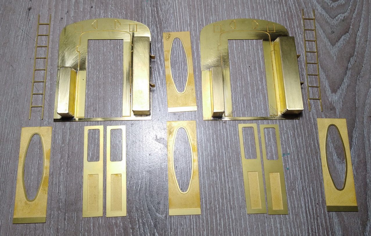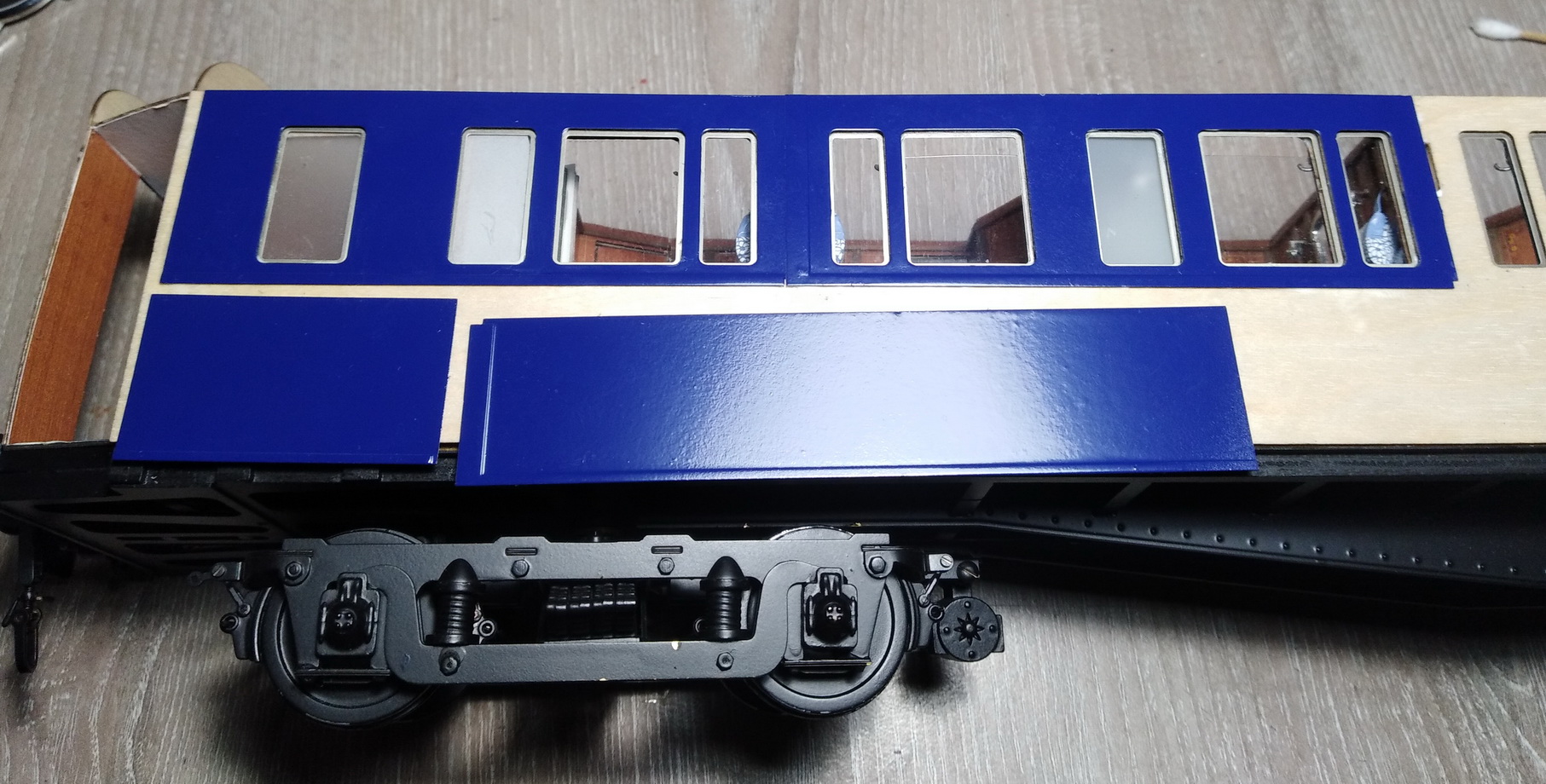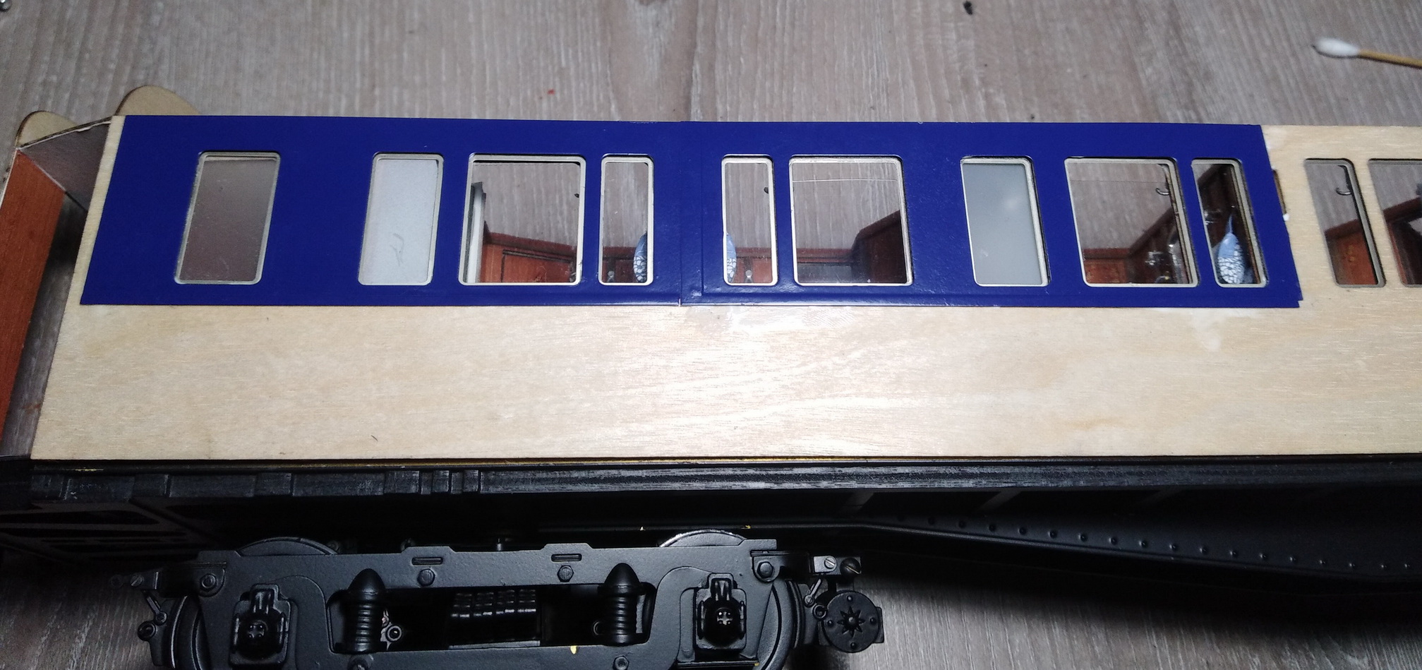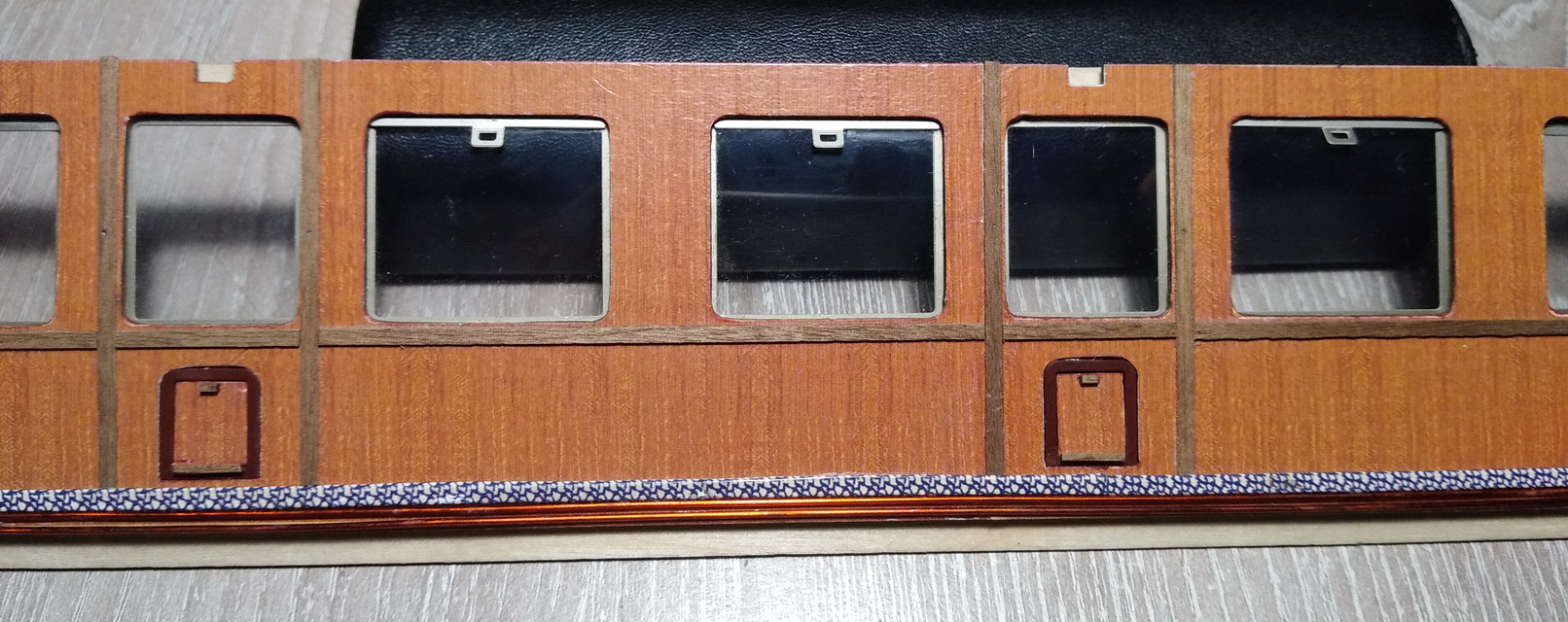 По размышлению, отступил от инструкции и внутренние панели наружных стен купе приклеил к остальным стенам. Потом к ним приклею среднюю часть (которая с решётками из полосок белого шпона), ну а потом обшивку. Между внутренней и средней частями будут располагаться подвижные стёкла (большие) и приклеены неподвижные (малые).