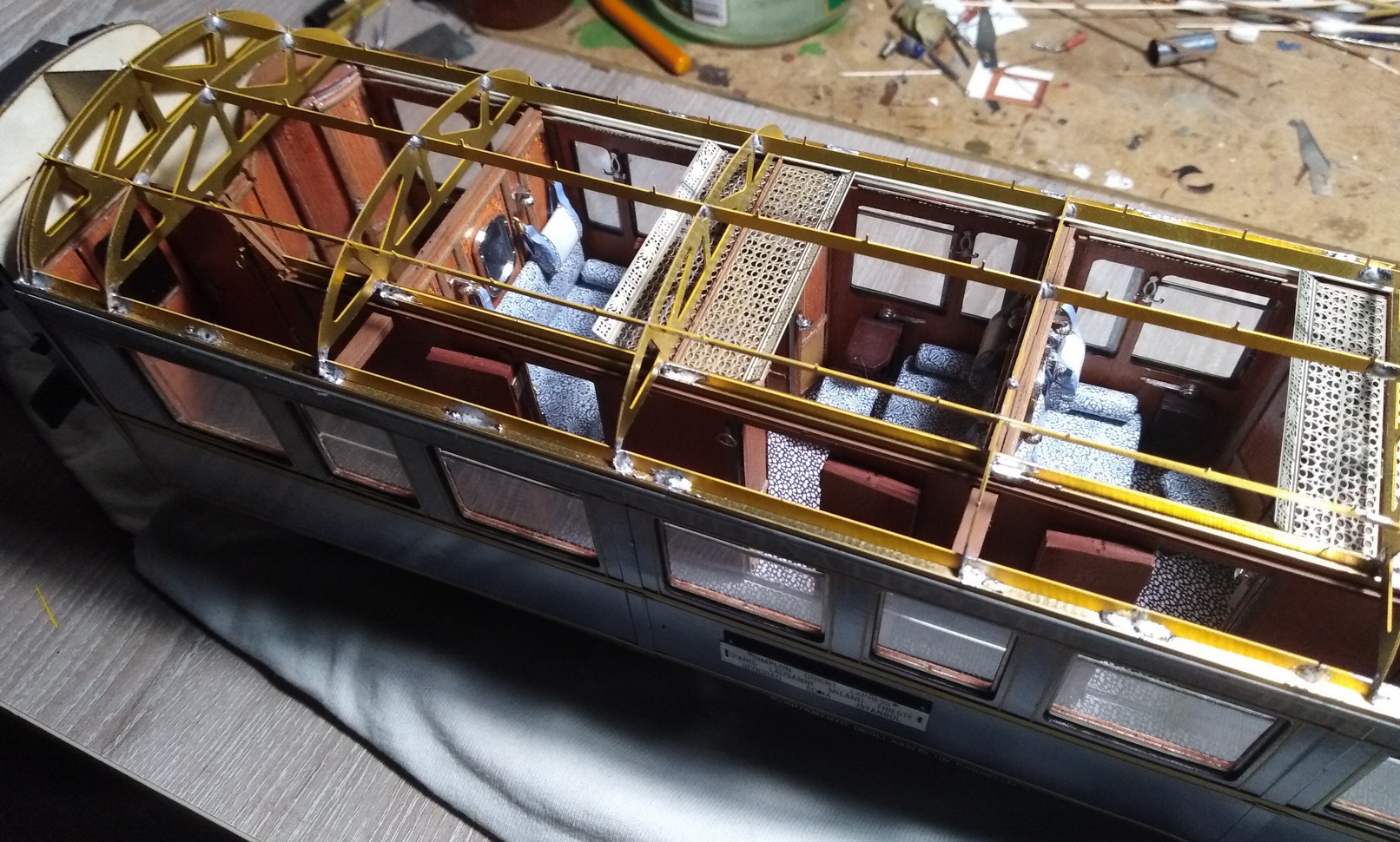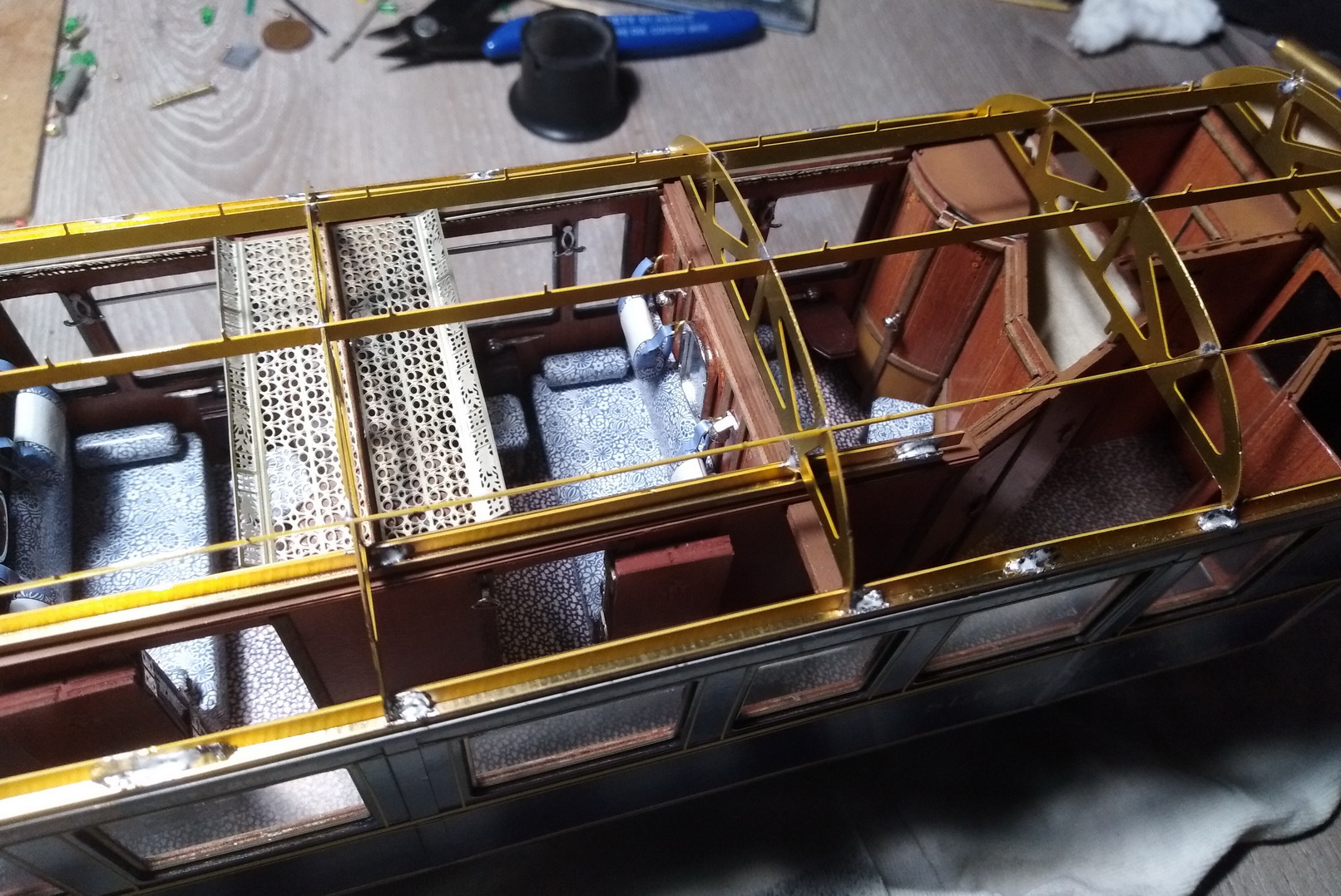 На внутренние панели в купе собрал и приклеил радиаторы отопления с откидными столами, вешалки, ручки для поднятия-опускания стёкол.