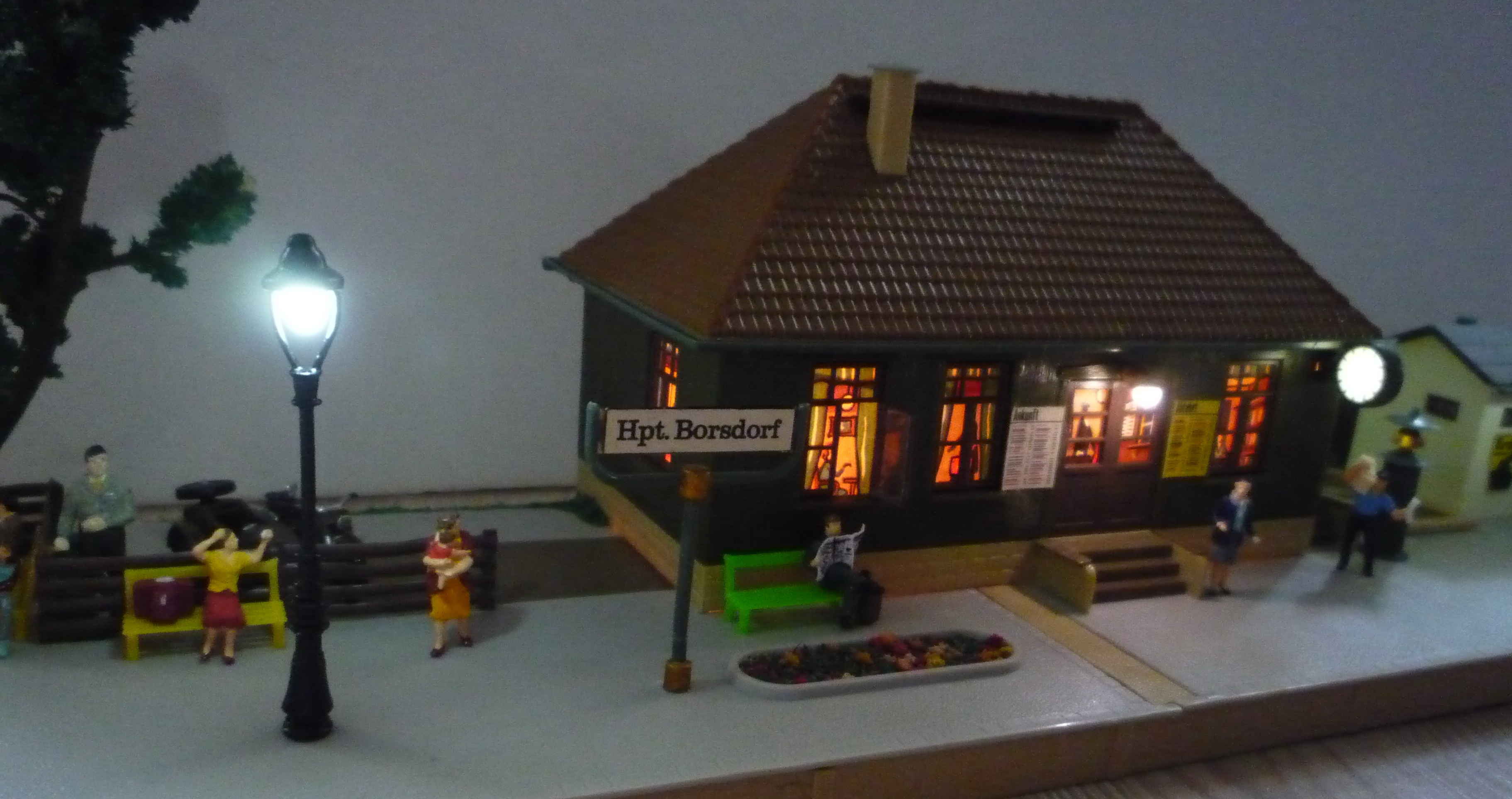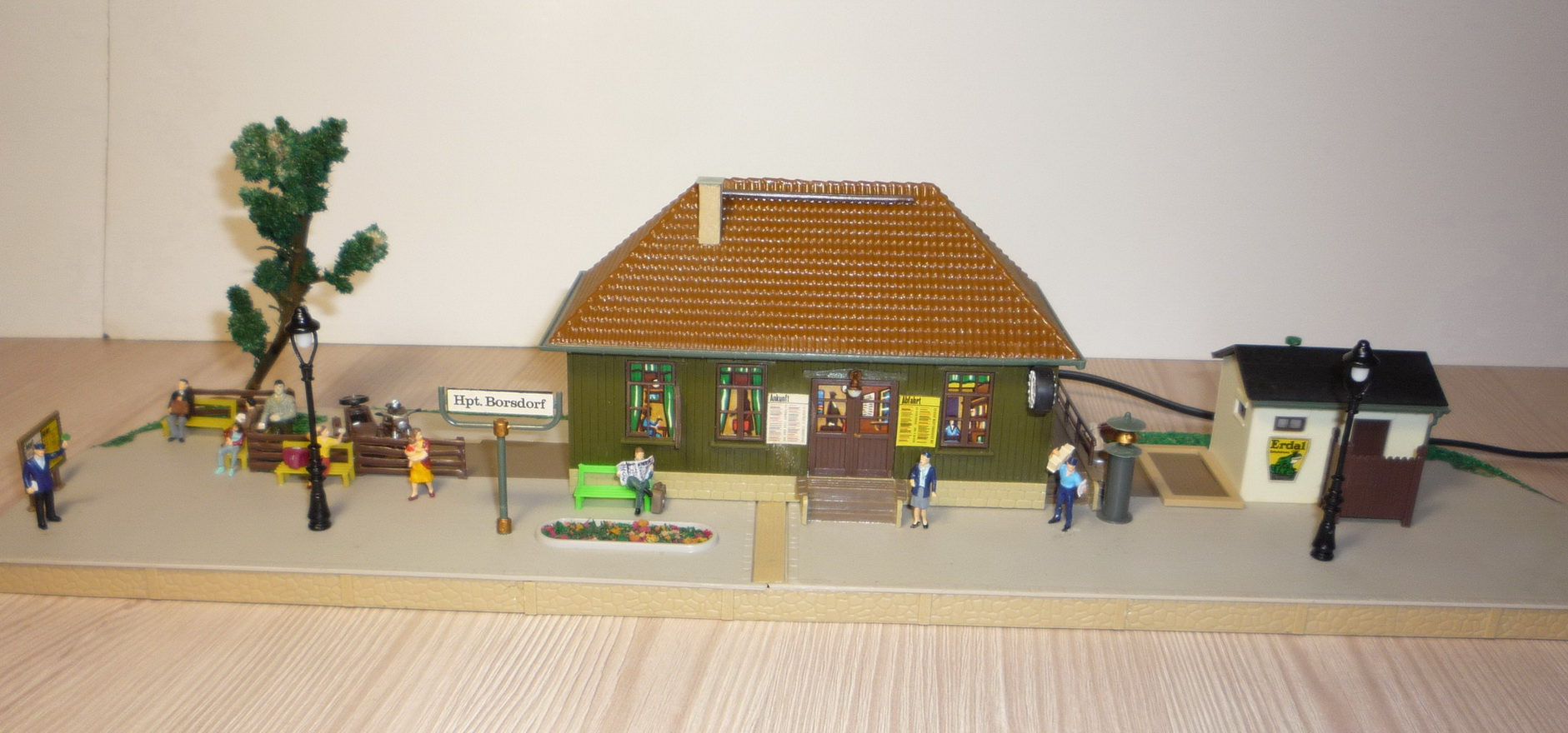 Неспешно собираю всё для макета. Тема - малодеятельная пригородная однопутная железная дорога DR III эпохи. Центральное место макета - вокзал. Из имеющихся у меня трёх штук нравится "Borsdorf". Его немного переделал, поставил фонари, провёл свет, примерно разбросал людей по перрону.