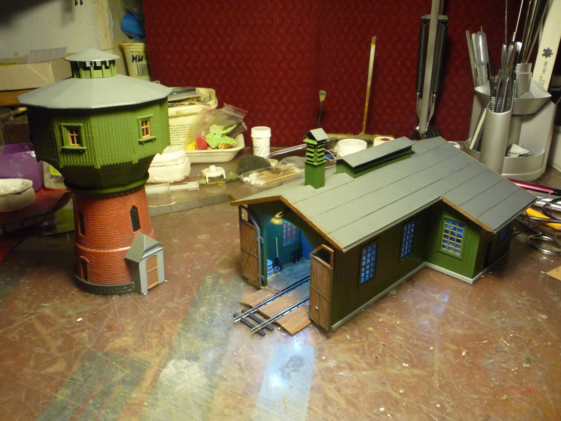 Далее - депо. Ничего подходящего по стилю не нашёл, решил сделать сам. Полистирол, шпон, бумага, проволока и т.п.