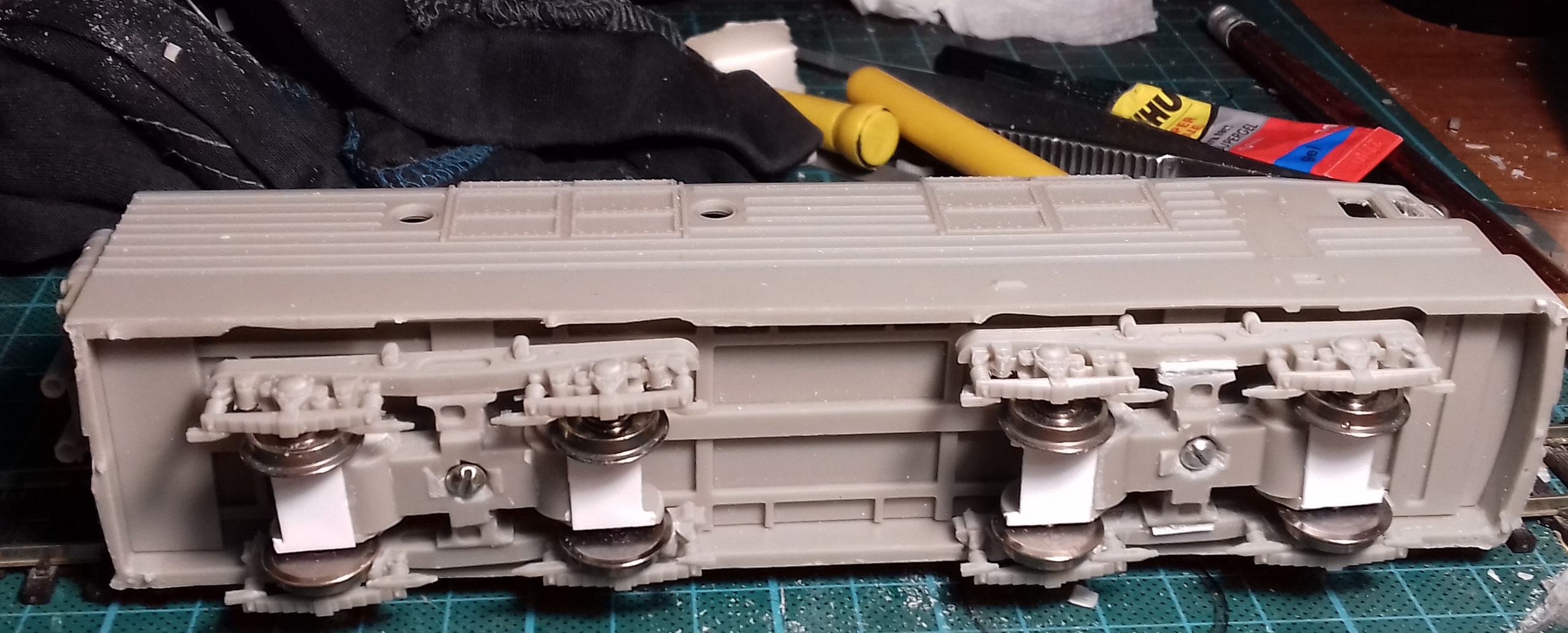 Чтобы выверить расстояние между секциями, приклеил основные элементы на задние части кузовов. Сцеп между секциями в итоге сделал жесткий. У "каталки" в штатное место СА3 - проволка, у моторной - дышло в НЕМ-шахту.