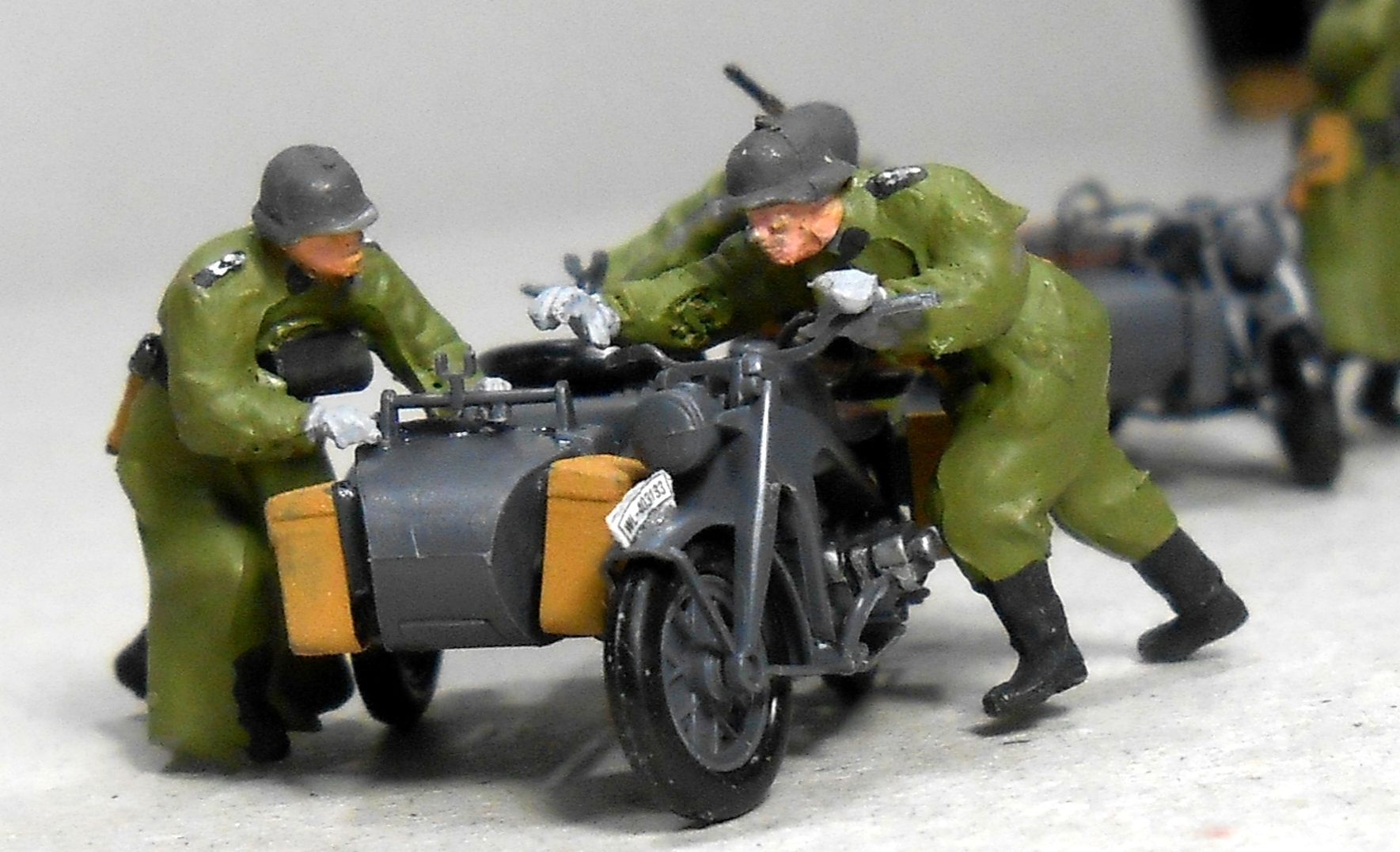 Прикольно получилось. А мне кажется, что противогазные бачки смещены для удобства толкания мотоцикла. А жетоны вроде как носили только жандармы. А вот и фото. Так что, все правильно отлито.