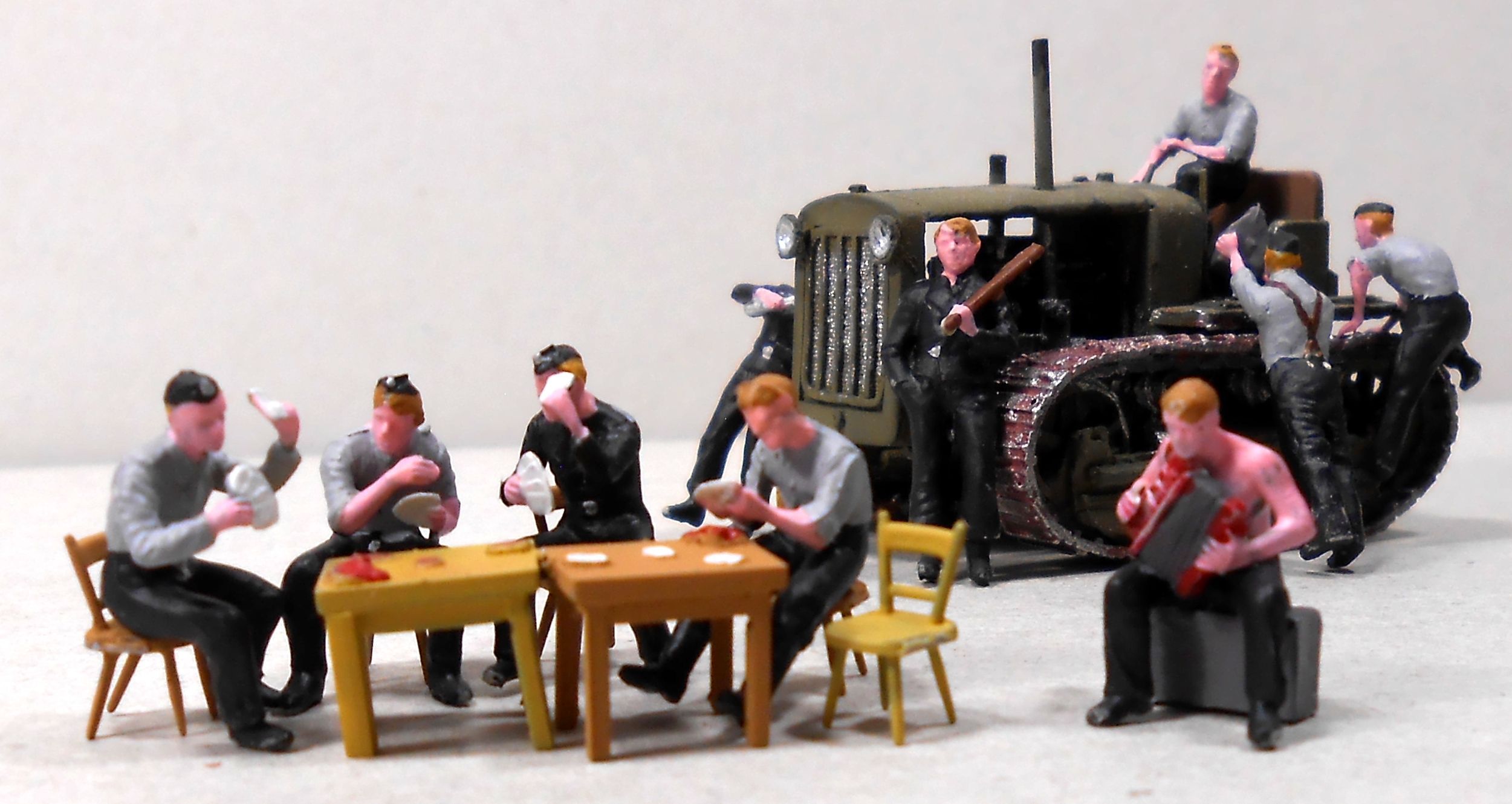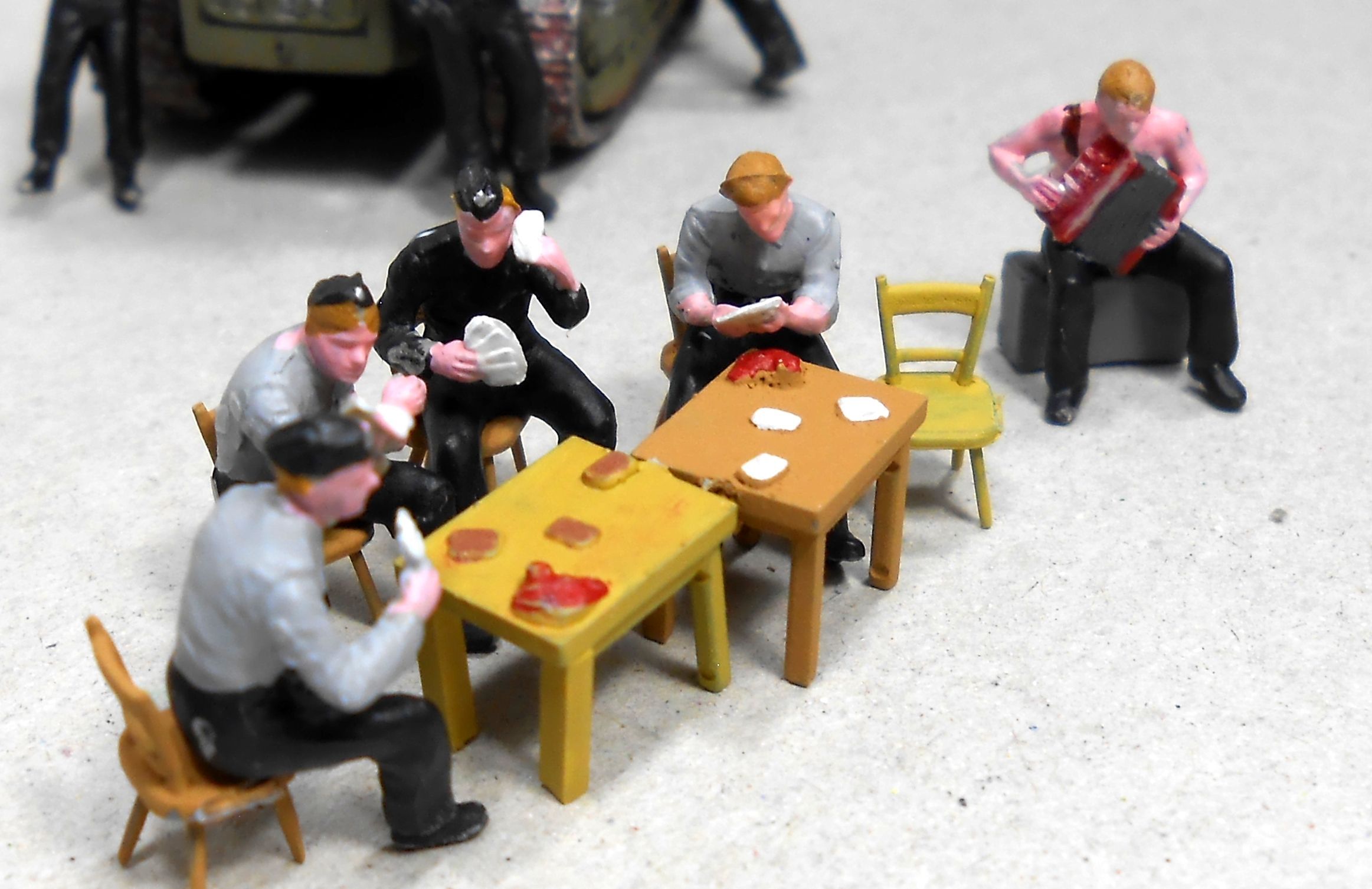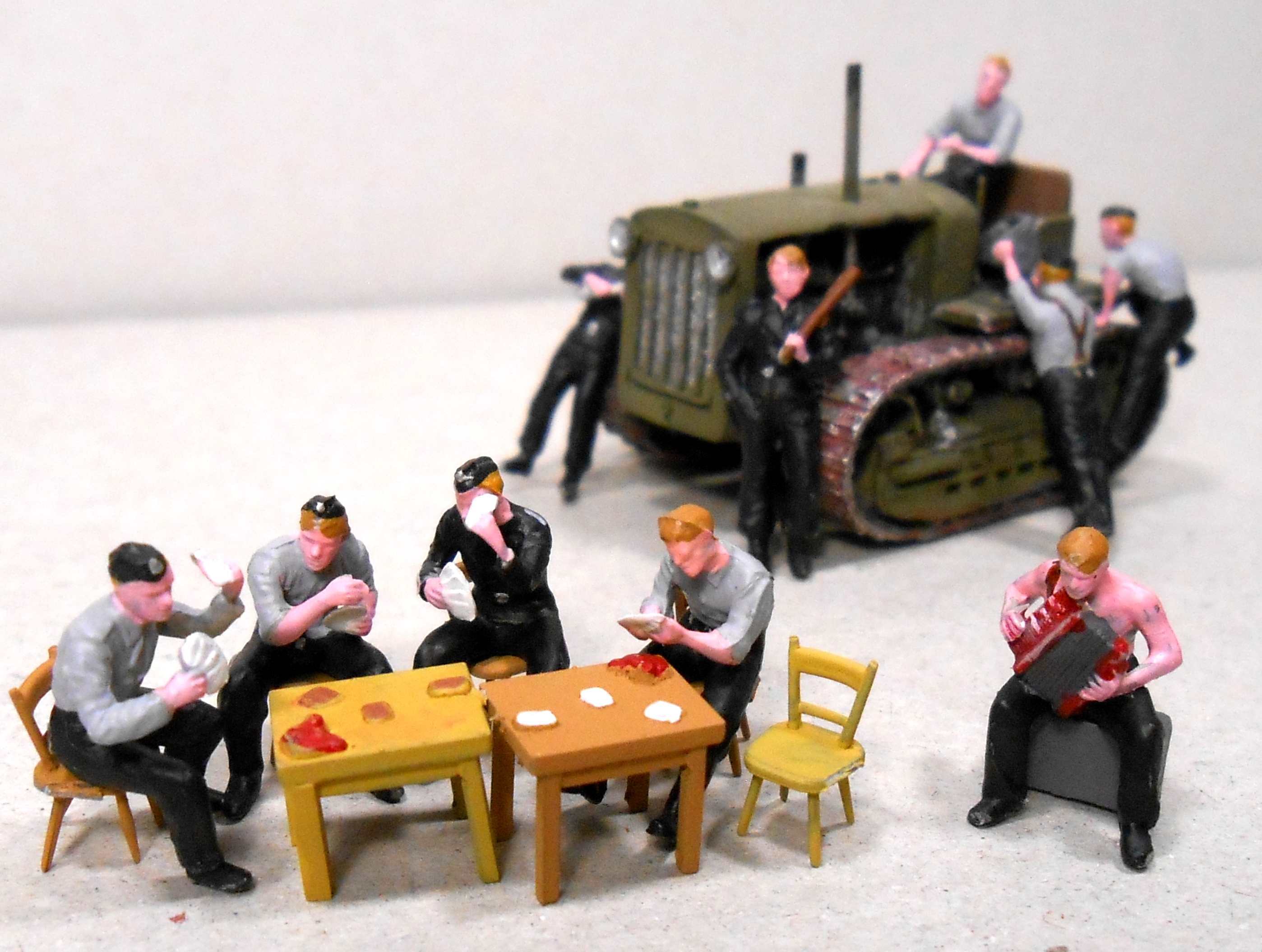 Очередной набор для сборки.Немецкие танкисты на привале, от Preiser.Масштаб Н0. В наборе 20 человек,два стола с имитацией жратвы на нем и набор стульев.