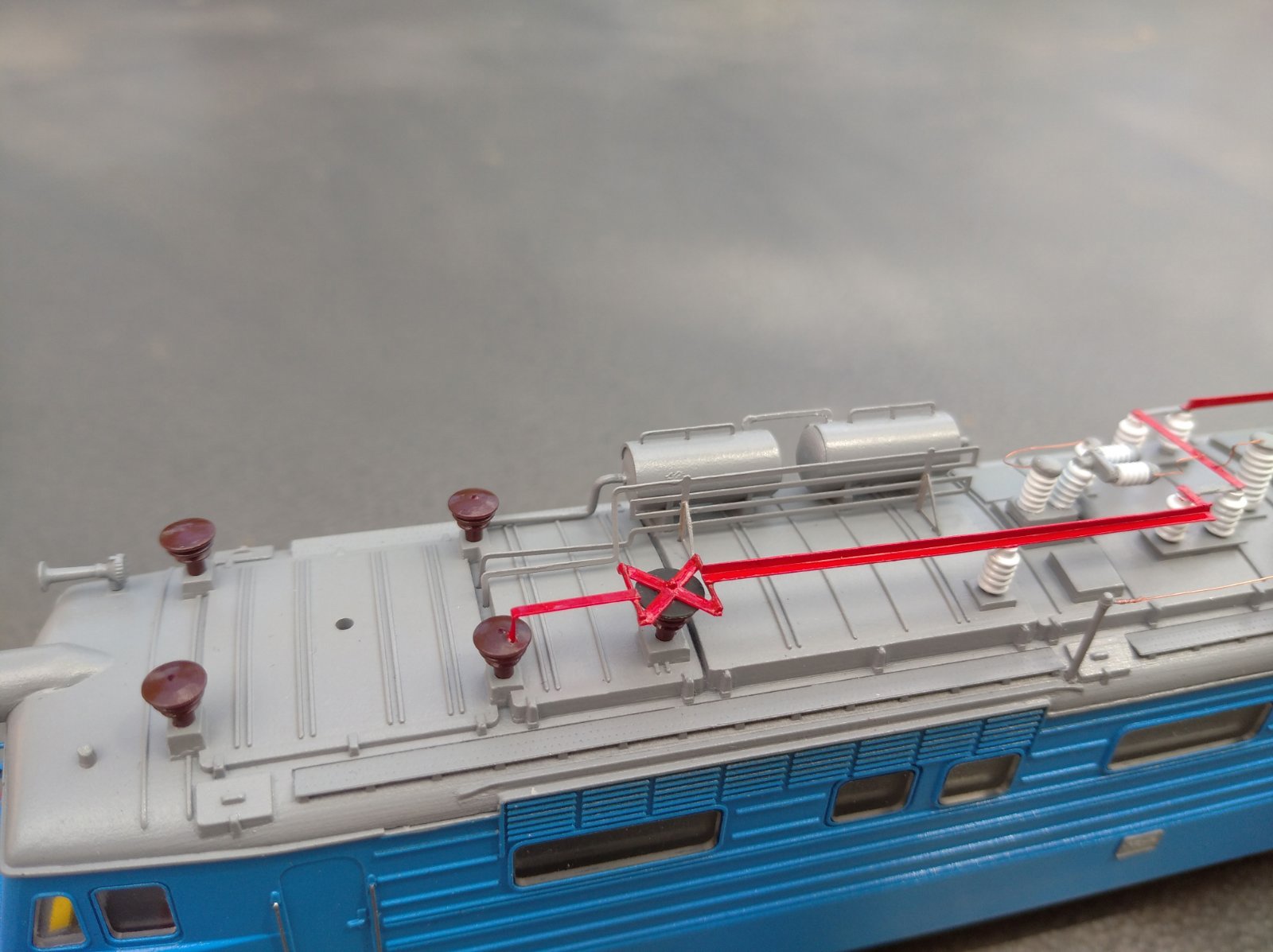 Что касается электровоза порочней на форкамерах то мне как то по душе было сделать из проволоки нежели из травла, что касается жокс между секциями то кабеля я делал из проволоки и красил в бежевый цвет.
