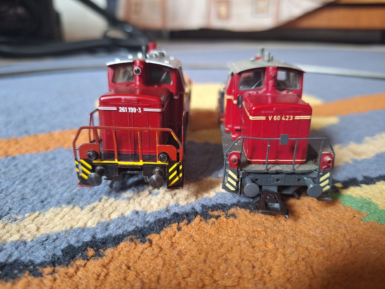 Доброго вечора, панове. Маю v60 від Roco, дуже побитий, але сучасна модель, з маховиком, NEM шахти, динамічні зчіпки. Привід на одну колпару з бандажами. З мінусів - жахливий стан поручнів та підніжок. Замовляти запчастини не вмію і не планую, а вони ніби з капрону і клей їх не бере.