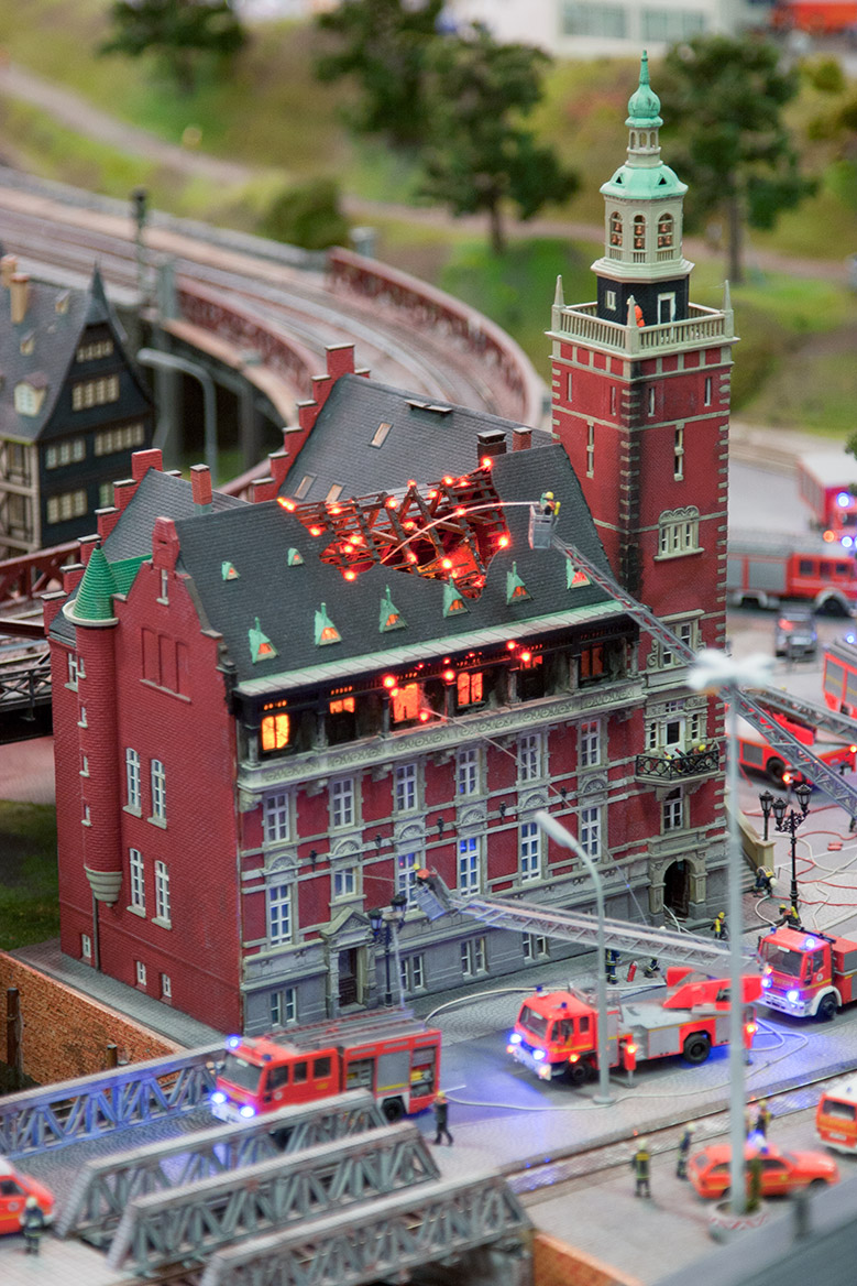 Вернемся к макету Миниатюр Вундерланд. Отдельный его сектор - город Кнуфинген. Город вымышленный, но именно в нем моделистам MiWuLa удалось реализовать то, что очень хотелось, но не удавалось в других частях макета, не нарушив при этом историческую достоверность. Здесь есть замечательный парк и замок (в котором, естественно, не обошлось без пожара с сильным задымлением, который, как и все остальные пожары в MiWuLa, успешно тушится), и депо с поворотным кругом для паровозов, и пожарная часть в красивом историческом здании, откуда на тушение пожара оперативно выезжают пожарные машины, и многое чего еще. Не буду сейчас говорить об аэропорте города Кнуфинген - это отдельная тема, и она еще впереди.
