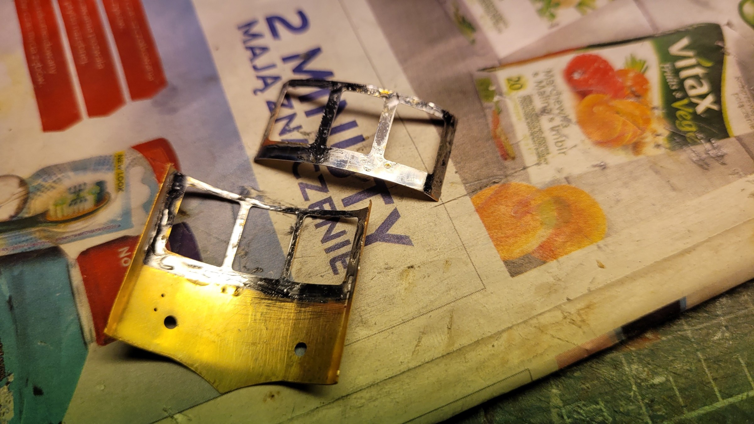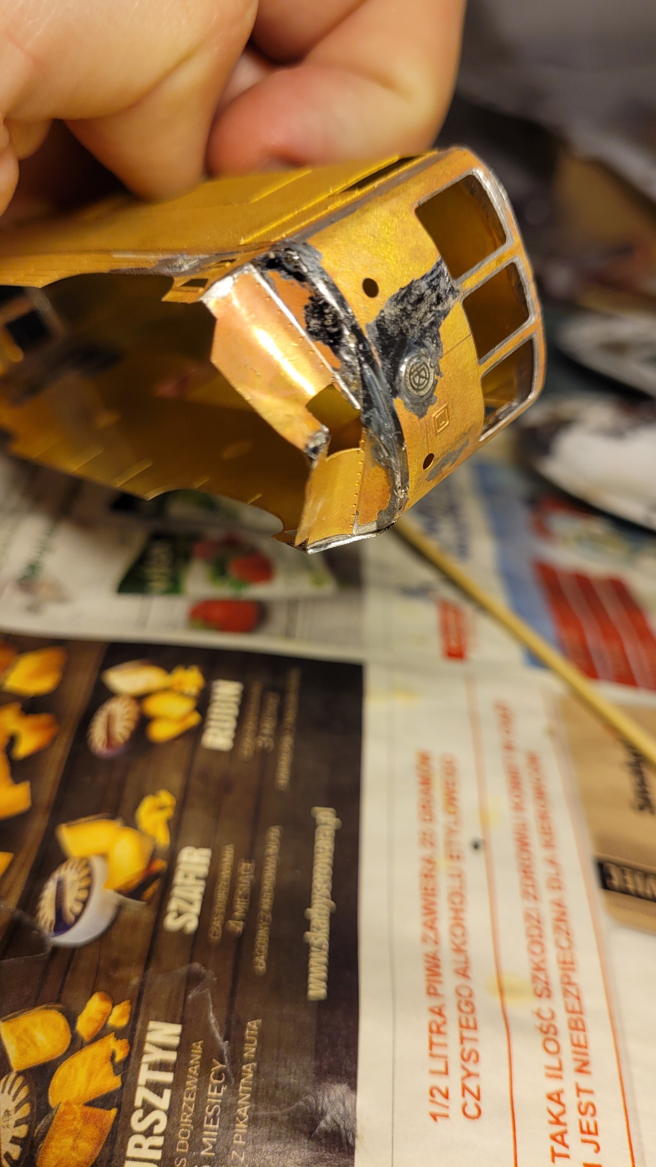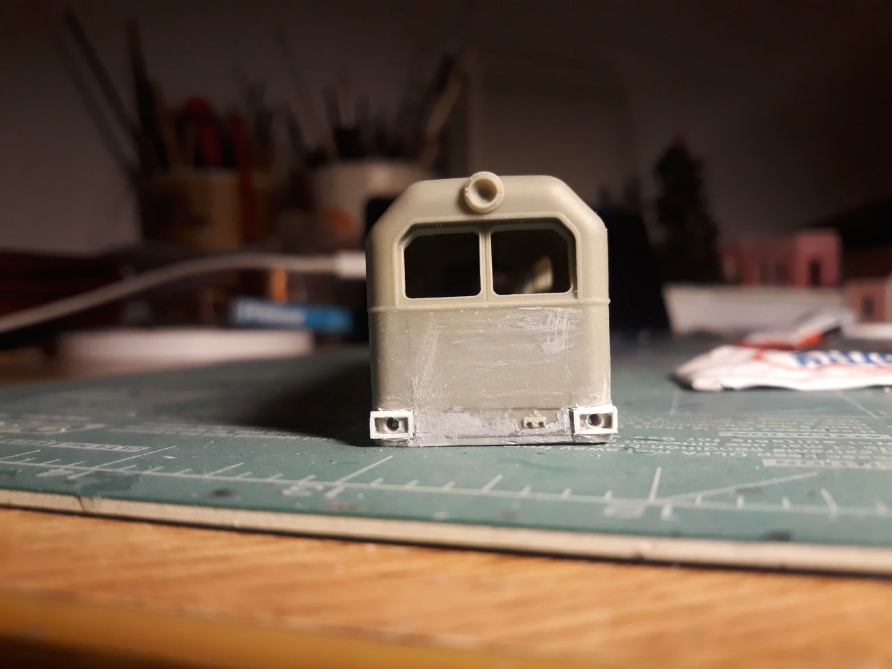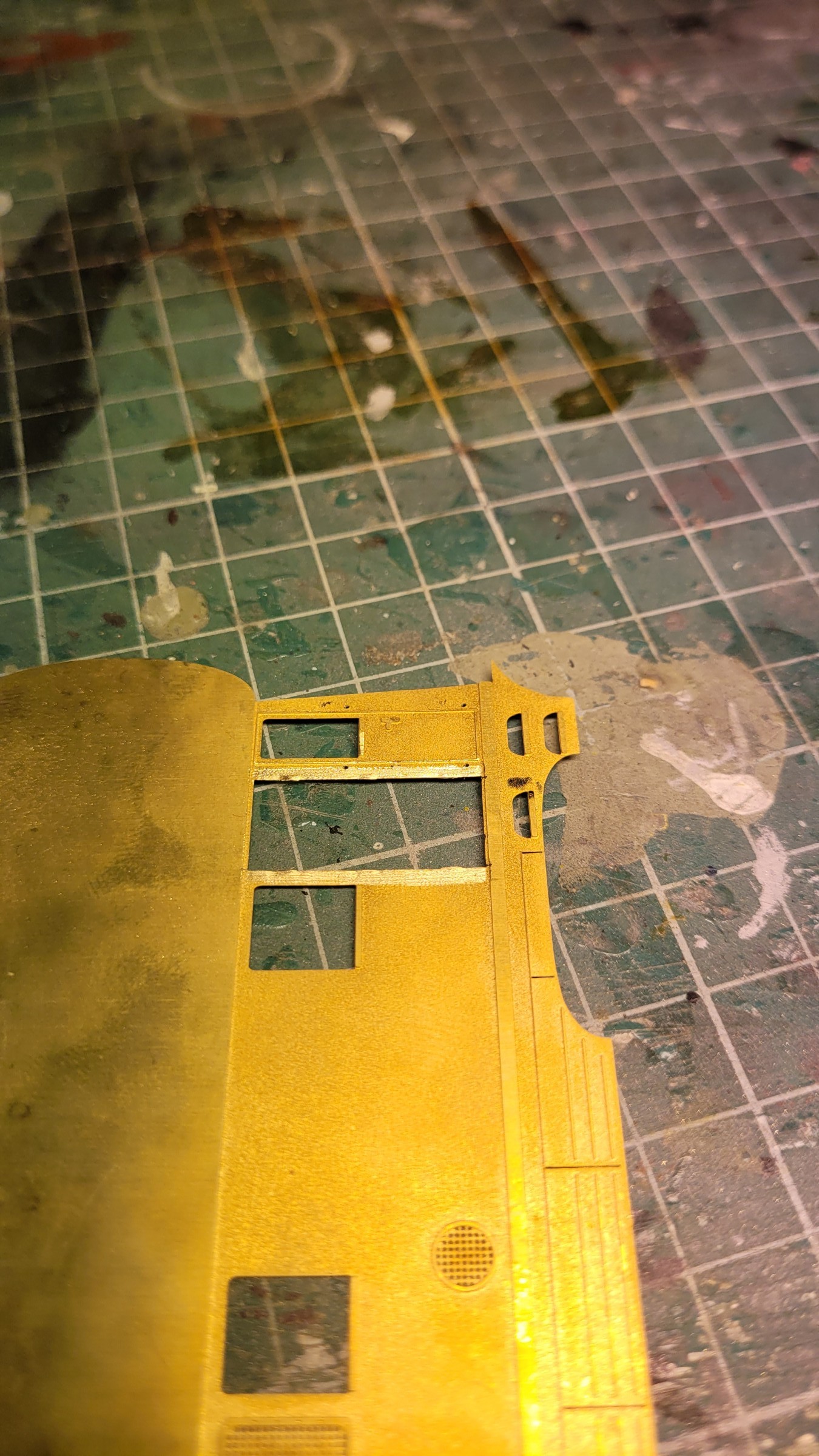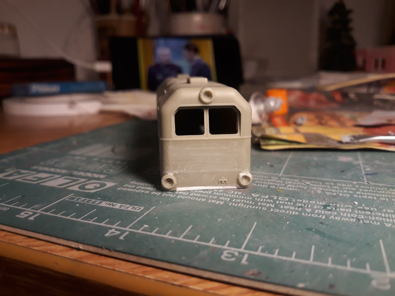 На раме нужно проточить выемки под двери, канавки под защёлки, сточить стойки для прожекторов, около 1 мм высоты топливного бака и защёлки на топливном баке.