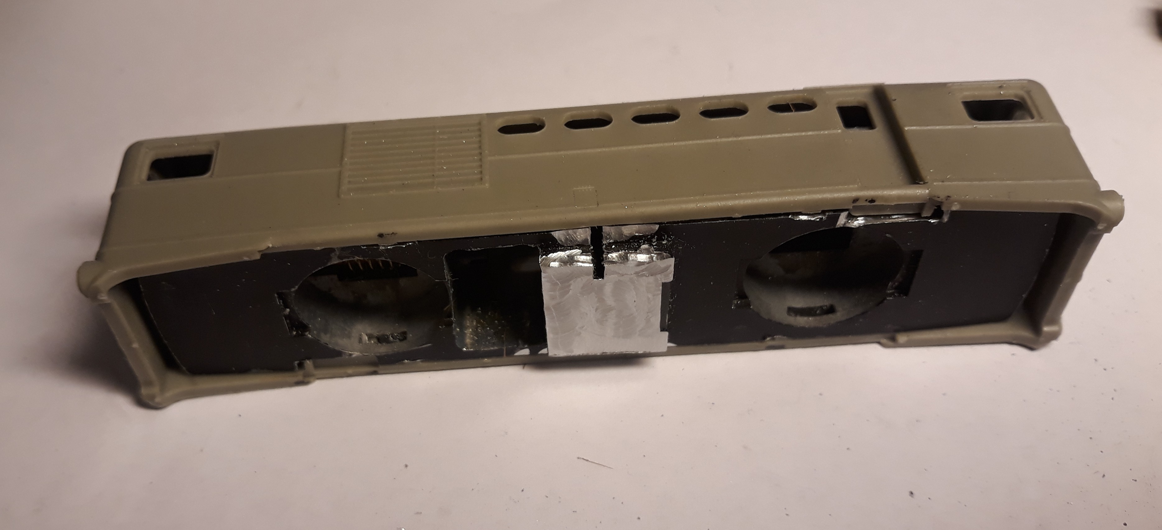 Затем приклеить её между передними частями боковин тележек. Для надёжности я усилил соединение кусочком пластика.