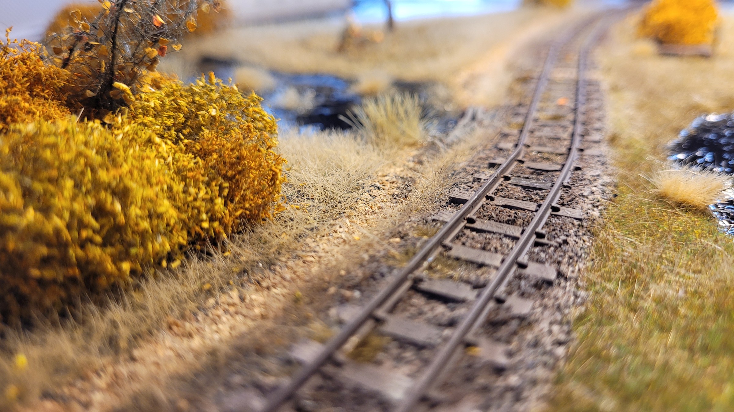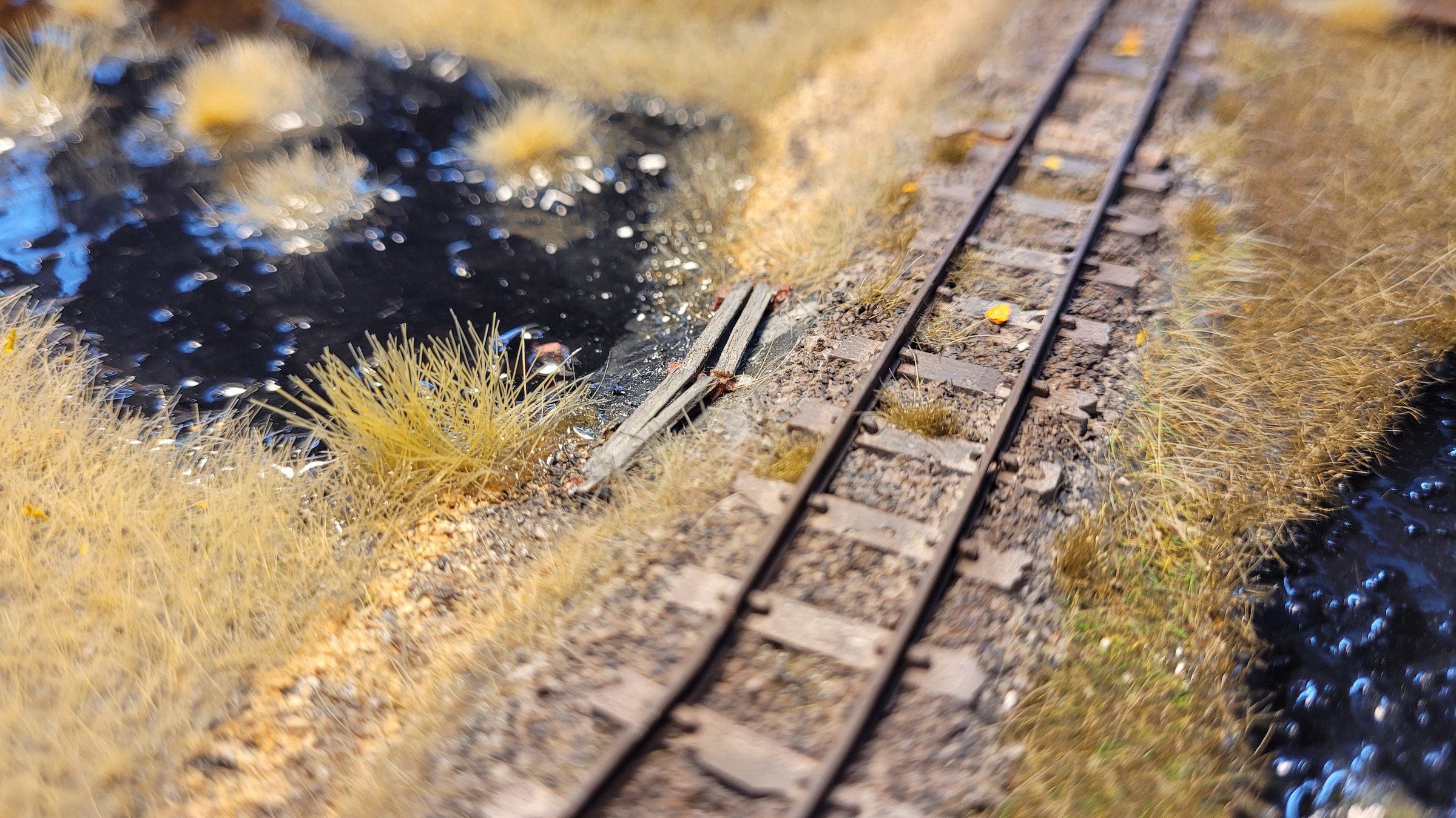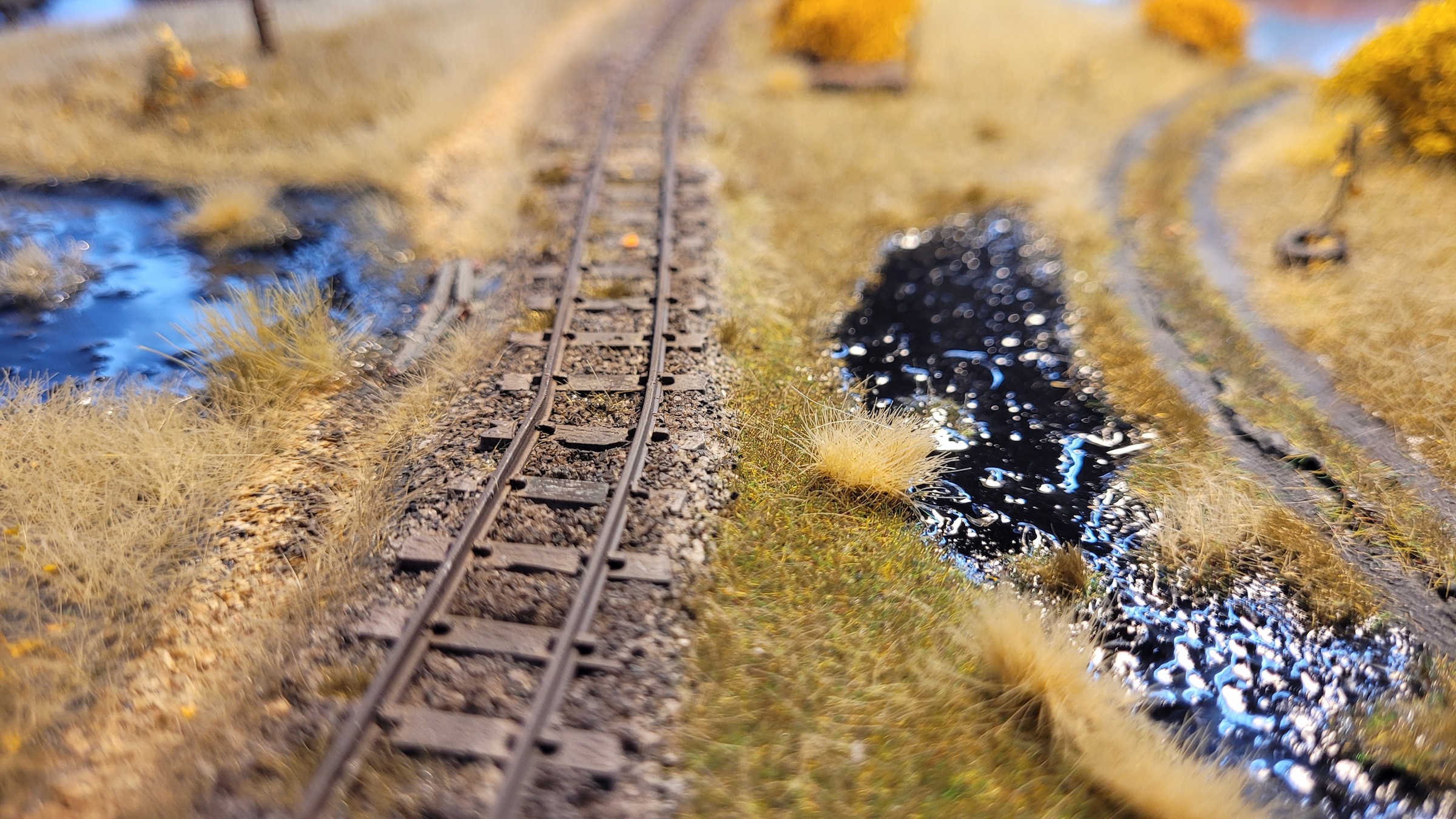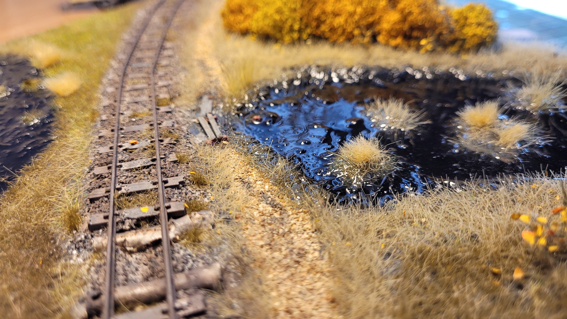 Убитые рельсы, парочка шпал, заменённых на брёвна, раздолбанная "грунтовая дорога", болото и ОСЕНЬ.