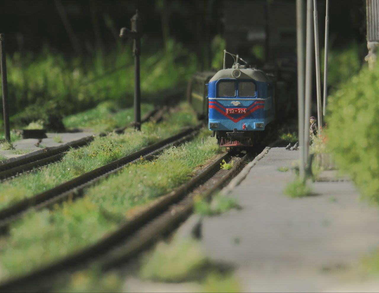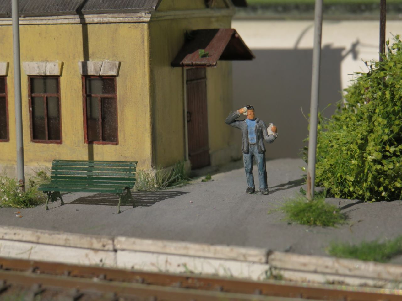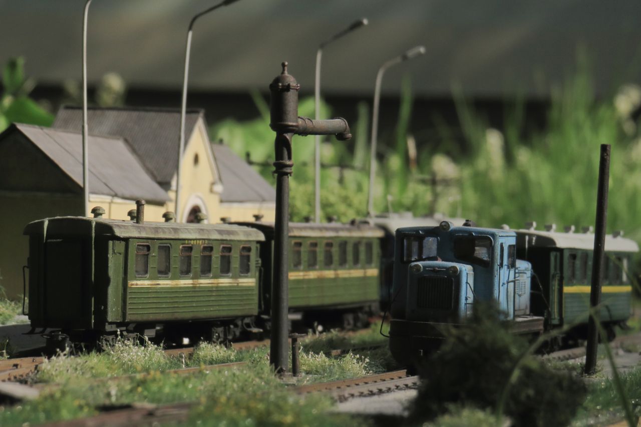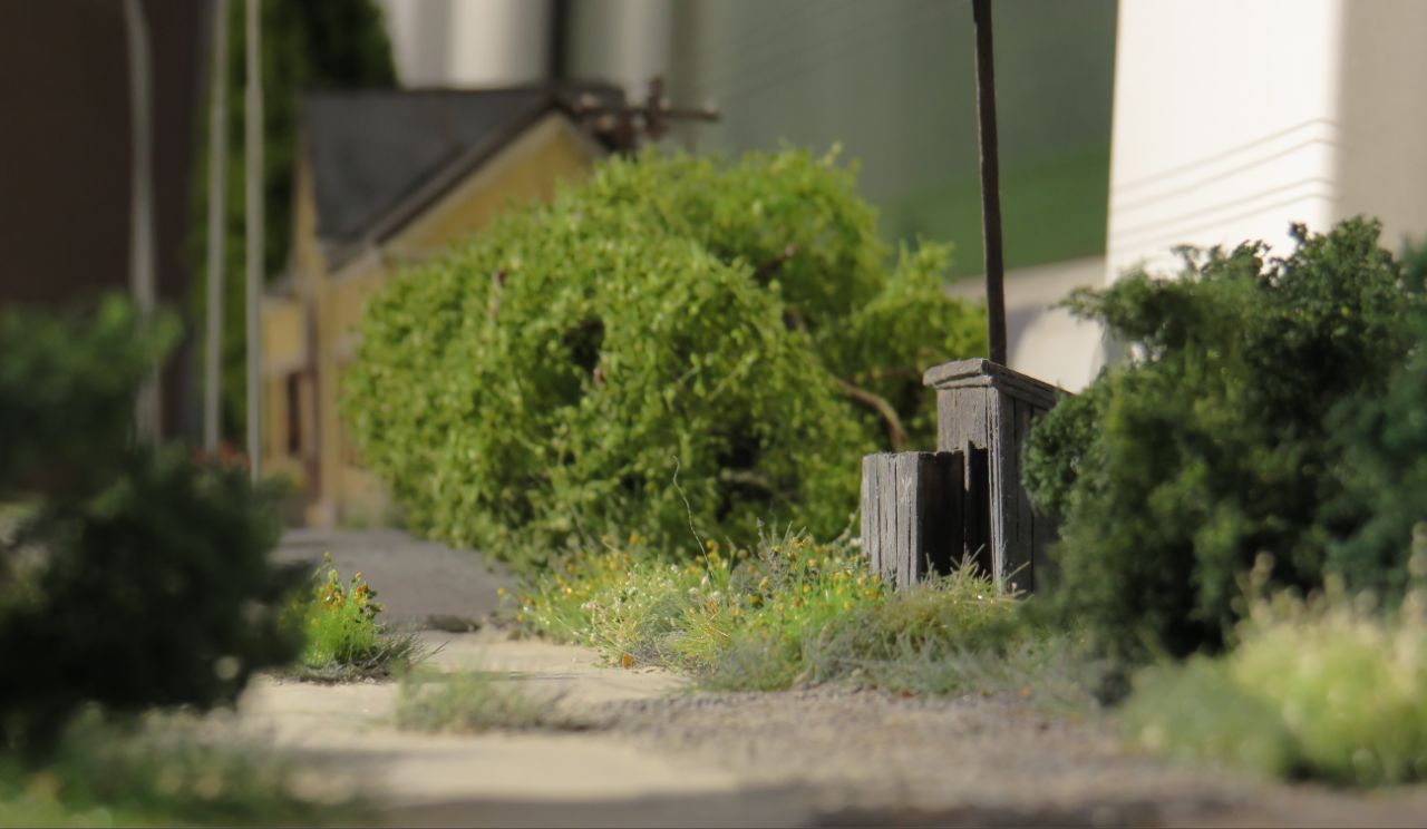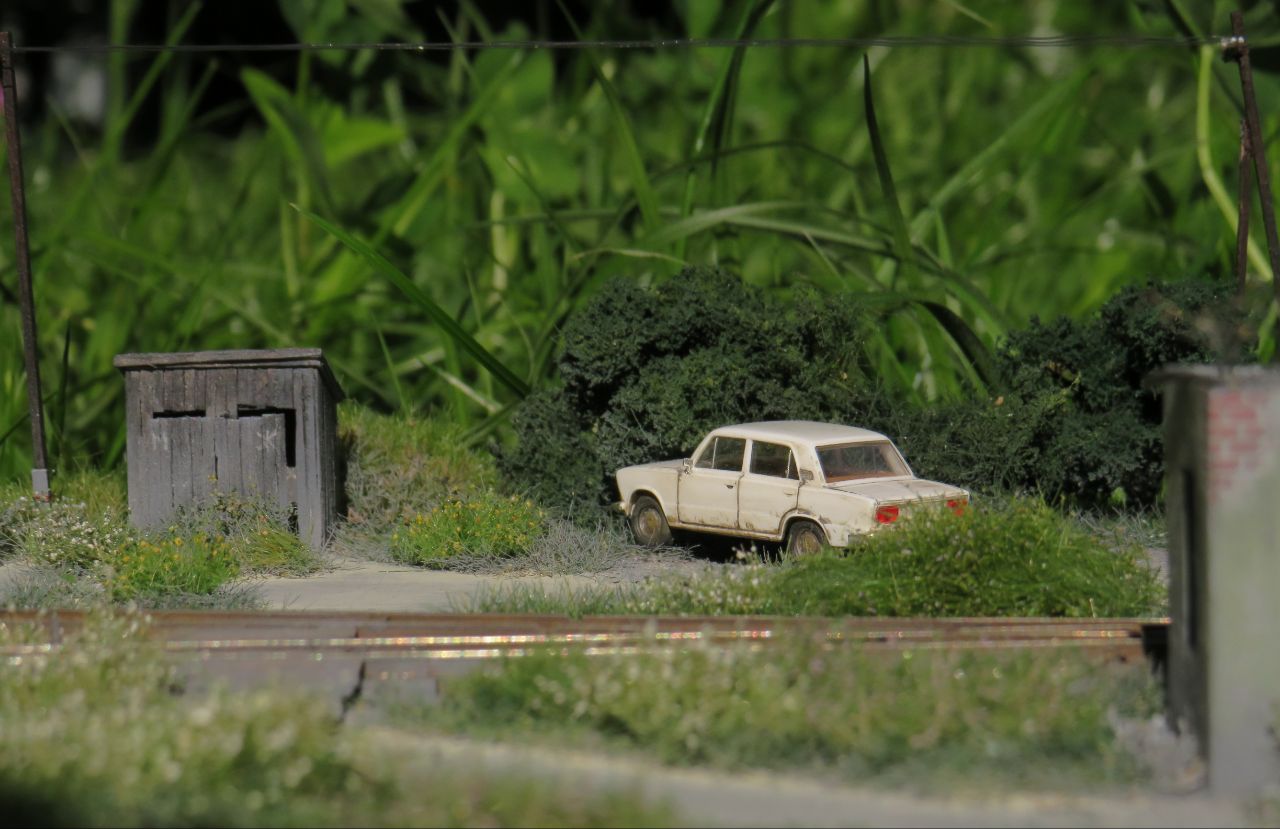 Большая часть мелочёвки - столбы с проводами, столб с громкоговорителем, деревянные лавки, урны, мусор, шпалы, предельные столбики и т.п. тоже сделана вручную.