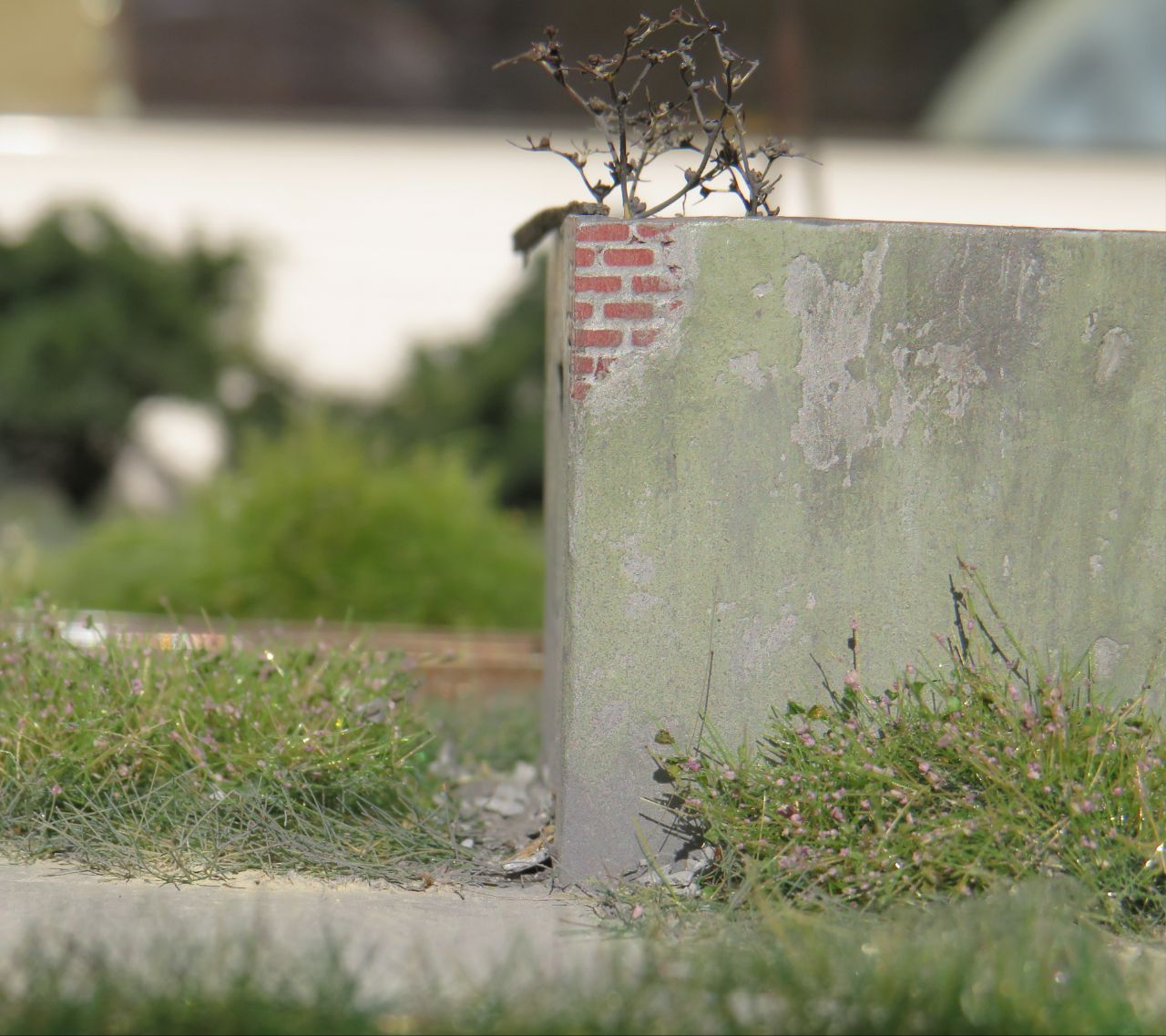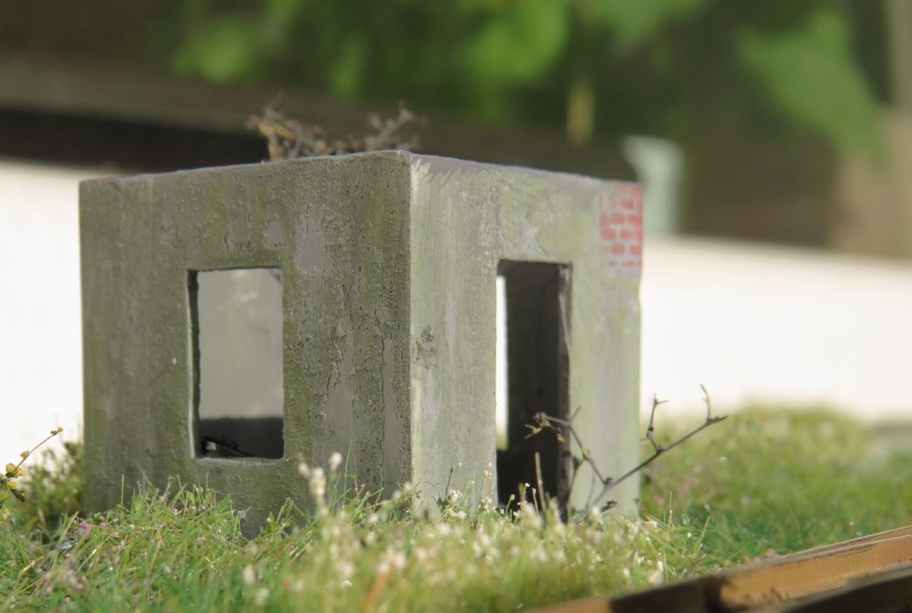 Возле здания и внутри есть имитация осыпавшейся штукатурки/цемента (особенно хорошо видно на фото "сверху"). Это тоже шпатлёвка: нанёс её на кусок малярного скотча, а когда высохла - содрал и измельчил пальцами. Насыпал на ПВА, когда приклеилось - потыкал кисточкой с жидко разведённой тёмно-серой краской.