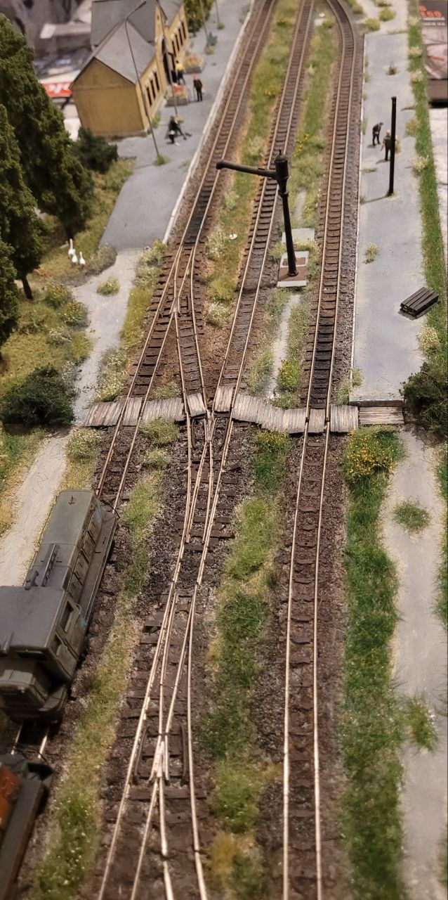 А на путях сделал вот съёмный деревянный переход. Элементы перехода держатся либо за счёт своей формы (просто "защёлкиваются" между путями) либо на двухстороннем скотче из супермаркета - он держит не очень хорошо, что и требуется - модули хранятся отдельно, держать их постоянно скручеными вместе мне негде.