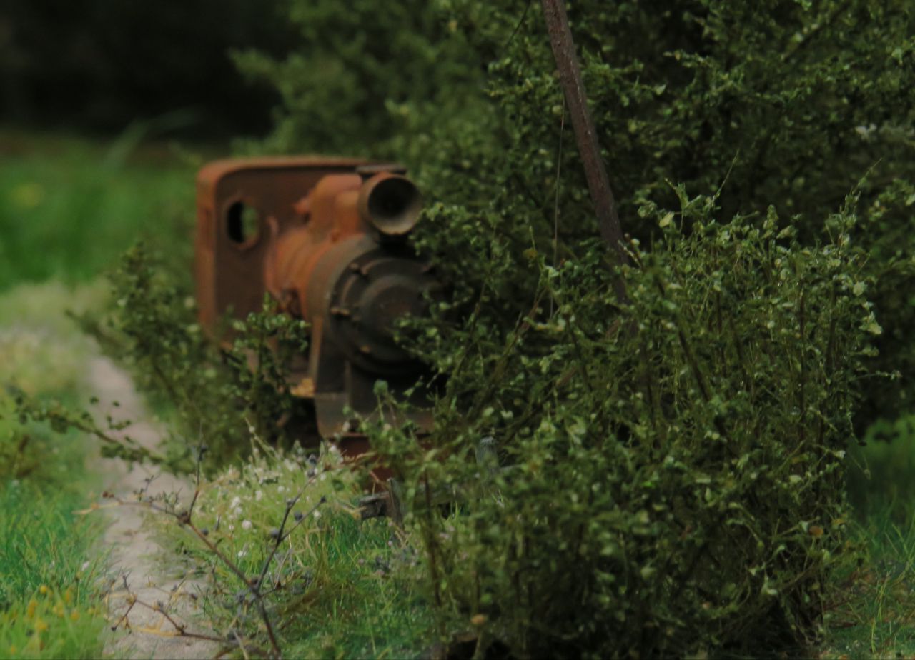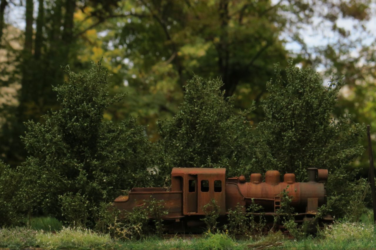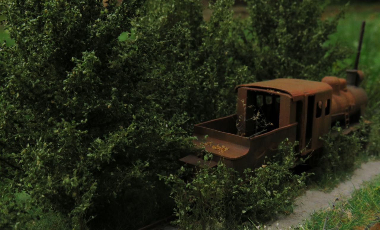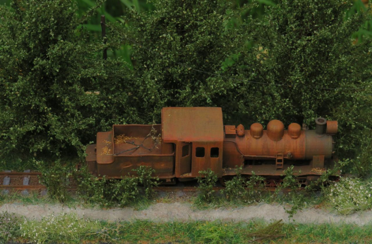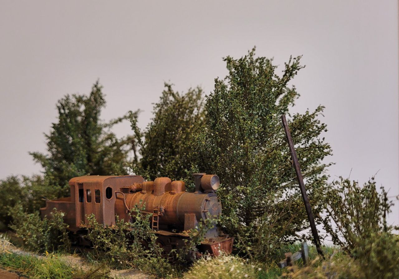 На диораме изображён заброшенный проржавевший паровоз Гр в заросшем тупике станции узкоколейки.