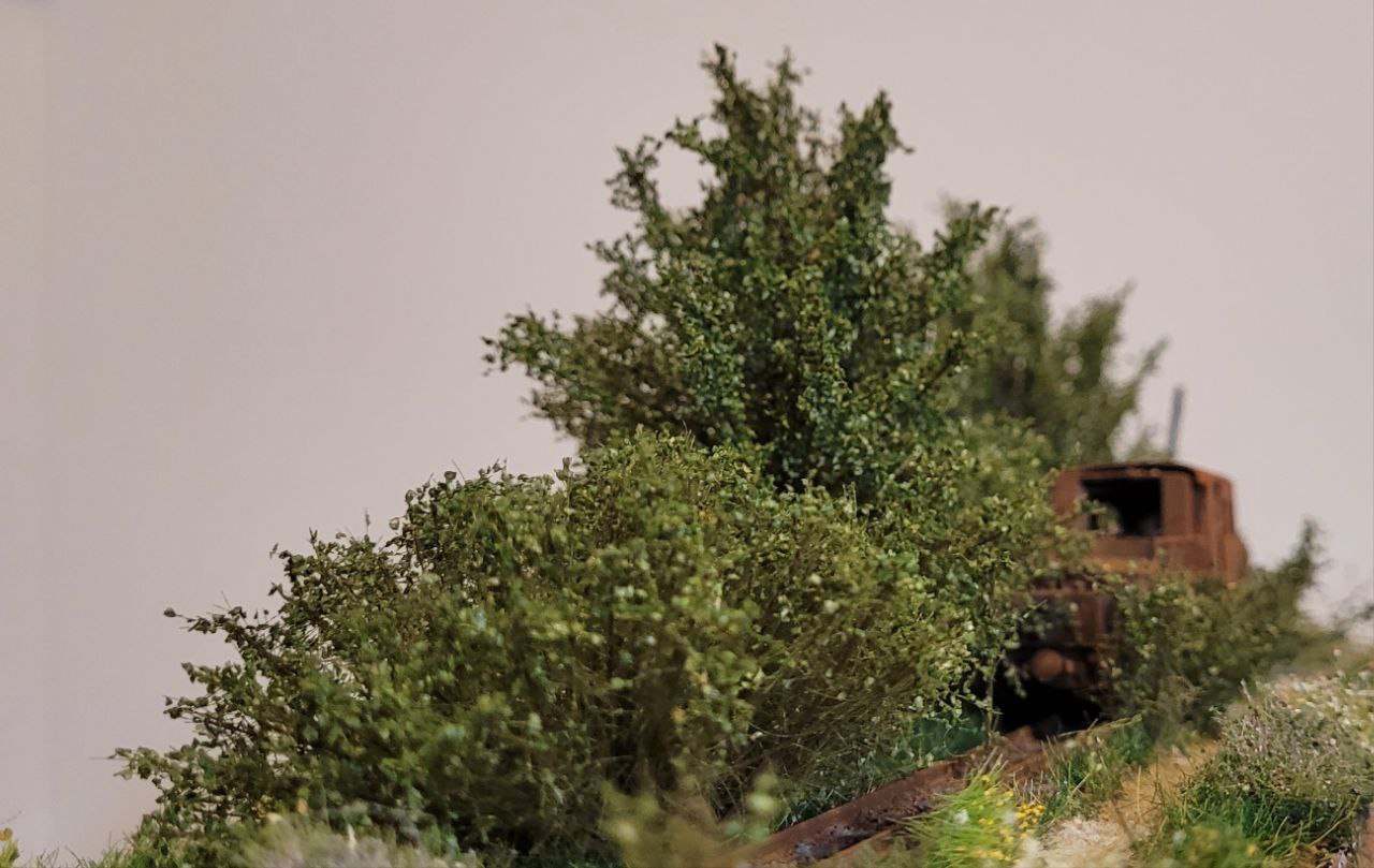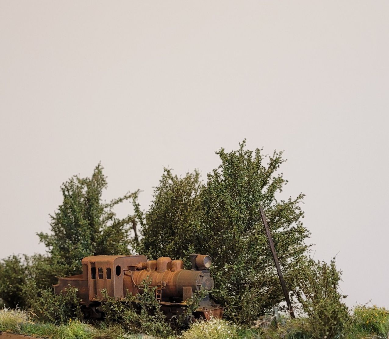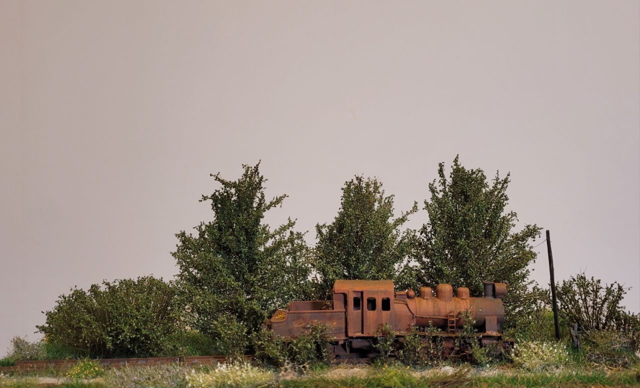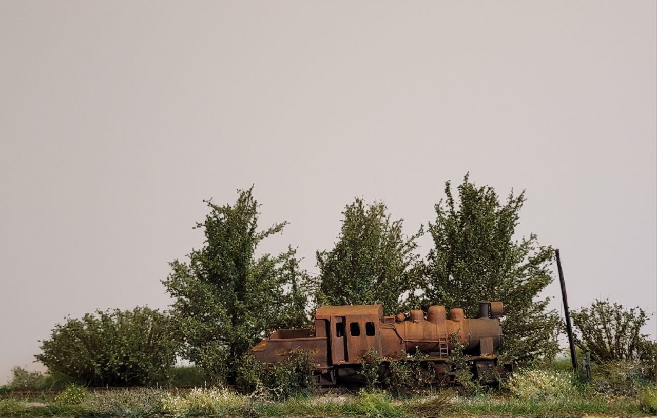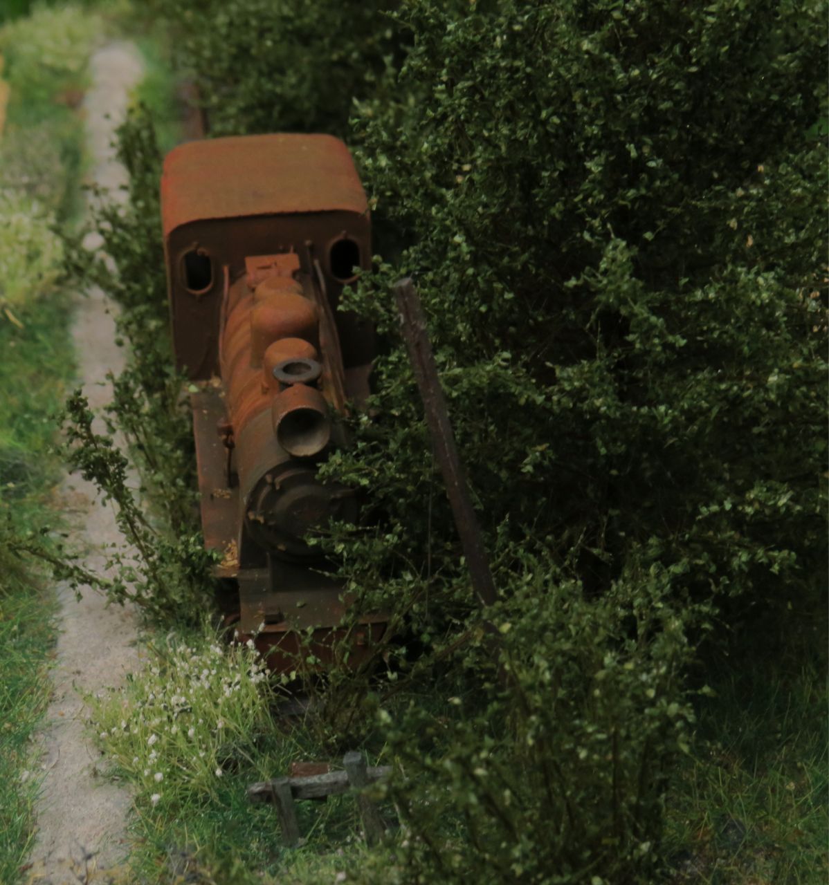 На диораме изображён заброшенный проржавевший паровоз Гр в заросшем тупике станции узкоколейки.
