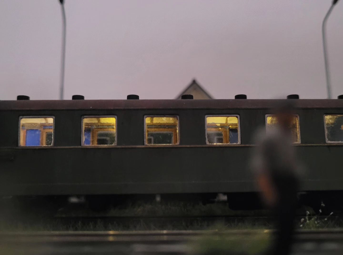 В этом вагоне я сделал освещение, но не просто вставил плату или наклеил светодиодную ленту, а просверлил штатные плафоны и вставил светодиоды. Светодиоды слегка мазнул краской и получился прототипичное освещение - при дневном свете его практически не видно, в темноте - вагон не сияет, как реактор, а скромно освещает салон.
