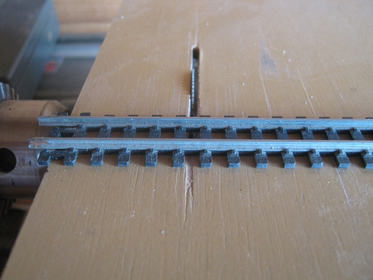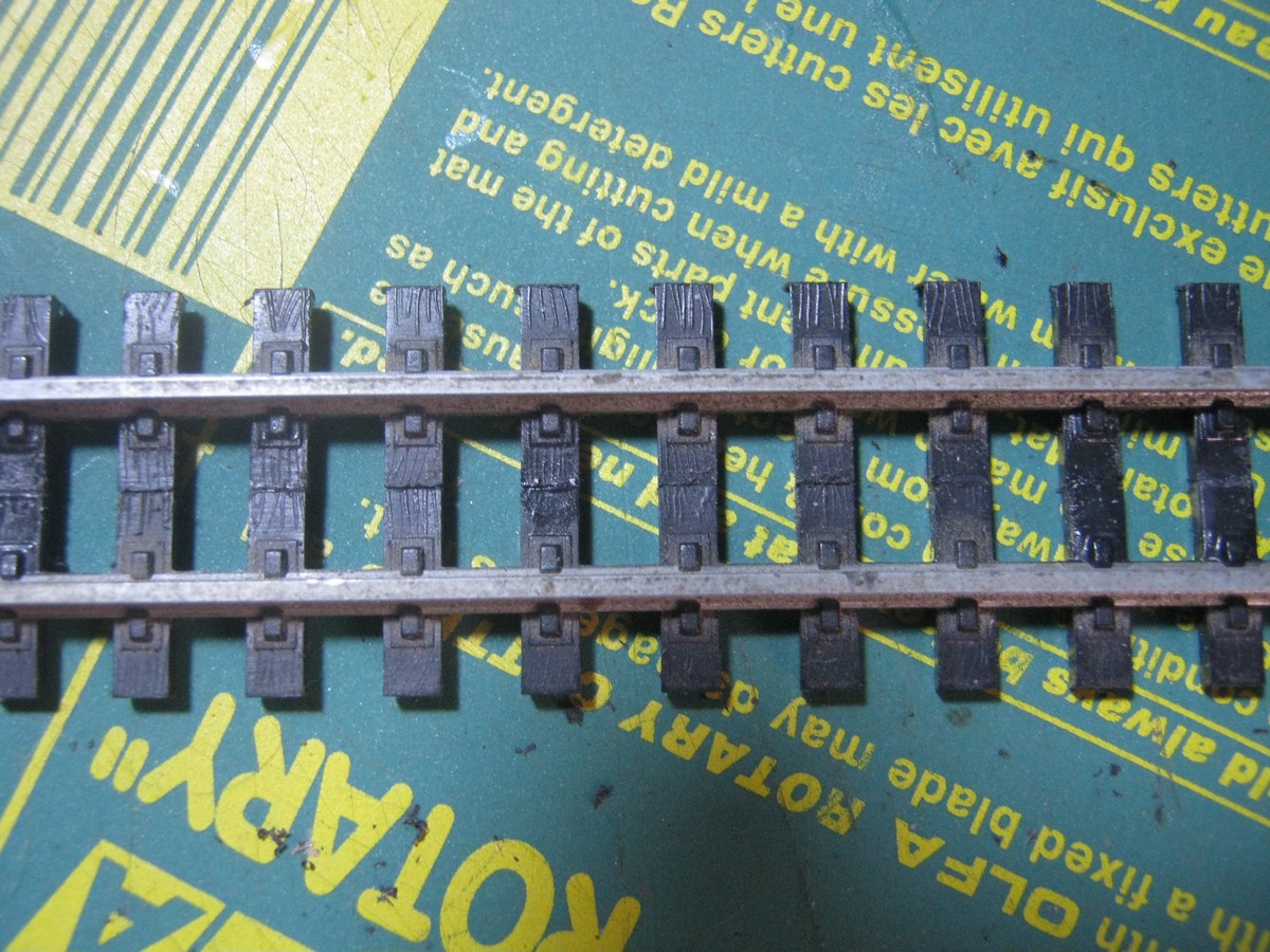 На снимке вверху оригинальный флекс в N, под ним три переделанных под H0e. Просто разрезана шпальная решётка и шпалы раздвинуты с увеличенным шагом, в моём случае примерно 5 мм.