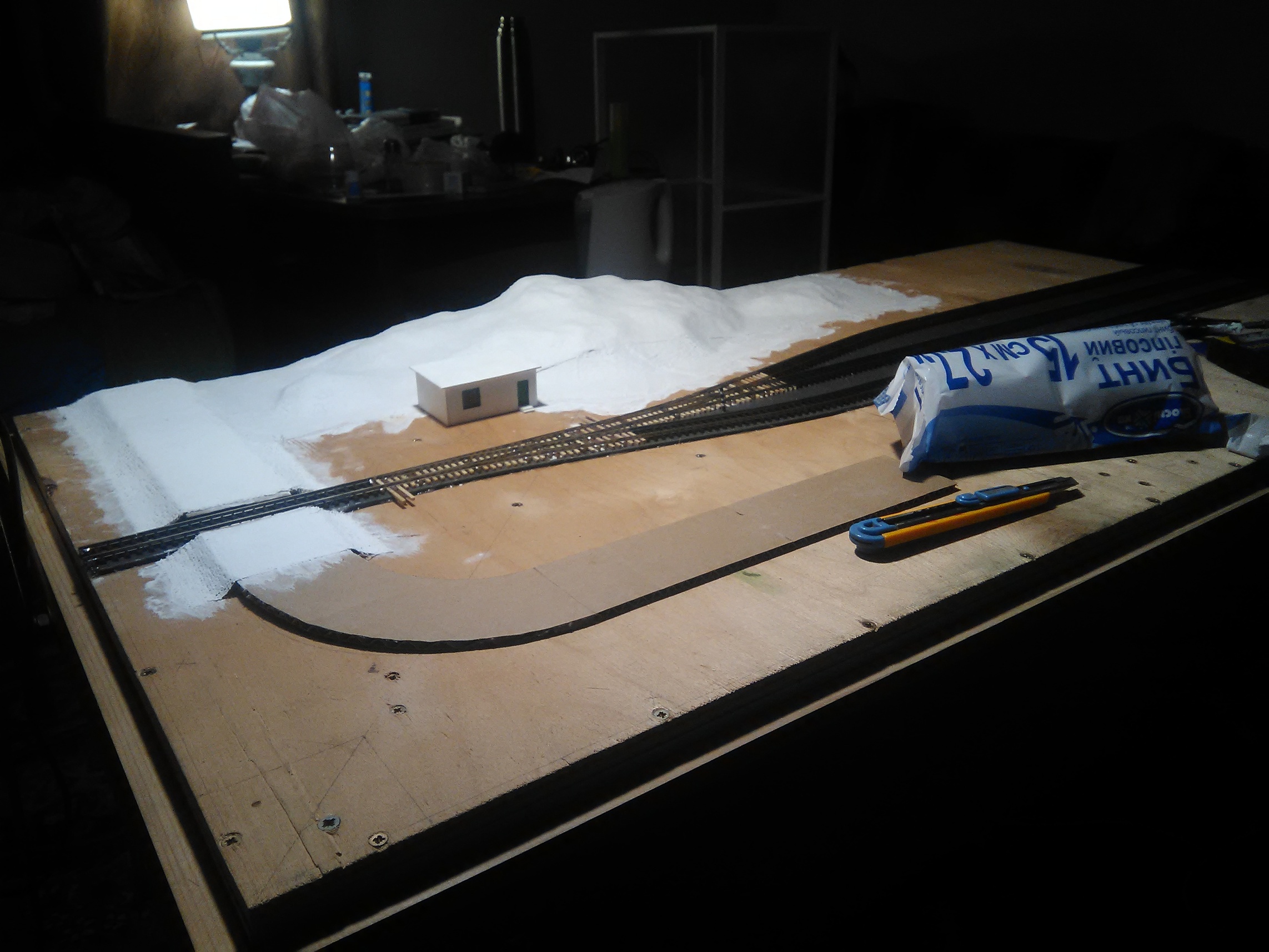 Нажмякав комків з паперу, позакріпляв малярним скотчем. З торця вирізав лобзиком на дошці "розріз гори" і приклеїв до підмакетника, щоб був жорсткий край. Зверху в два шари гіпсовим бінтом, сохне. Потім поправлю тонким шаром шпаклівки. Фанеру не грунтував нічим.