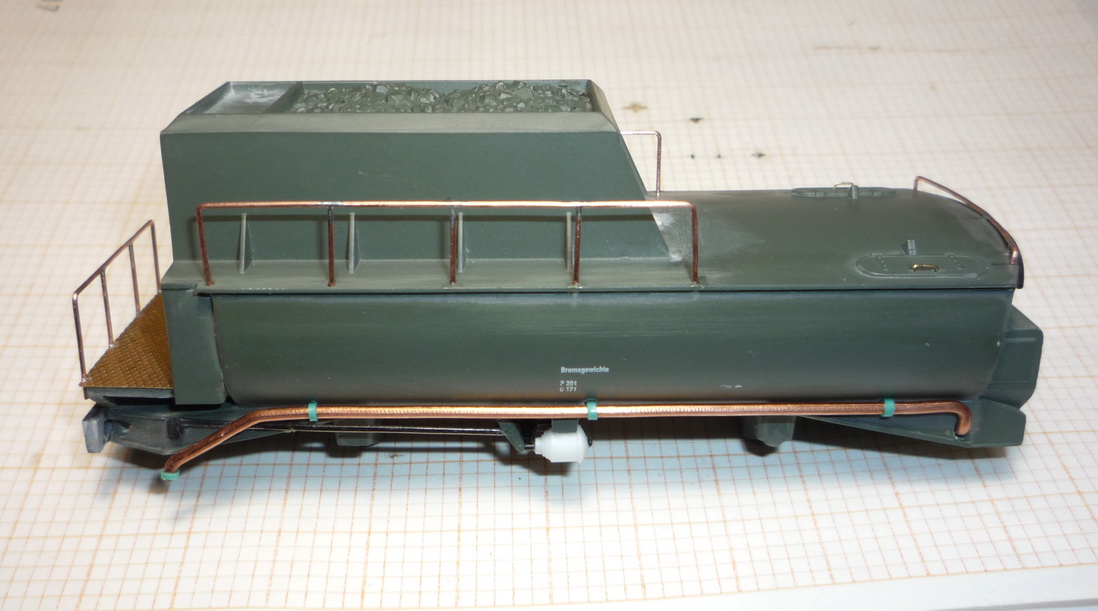 С тендера снял все приклеенные детали, с левой стороны срезал трубу, снизу - всю проводку, лестницы спереди и сзади, трубу сзади справа.