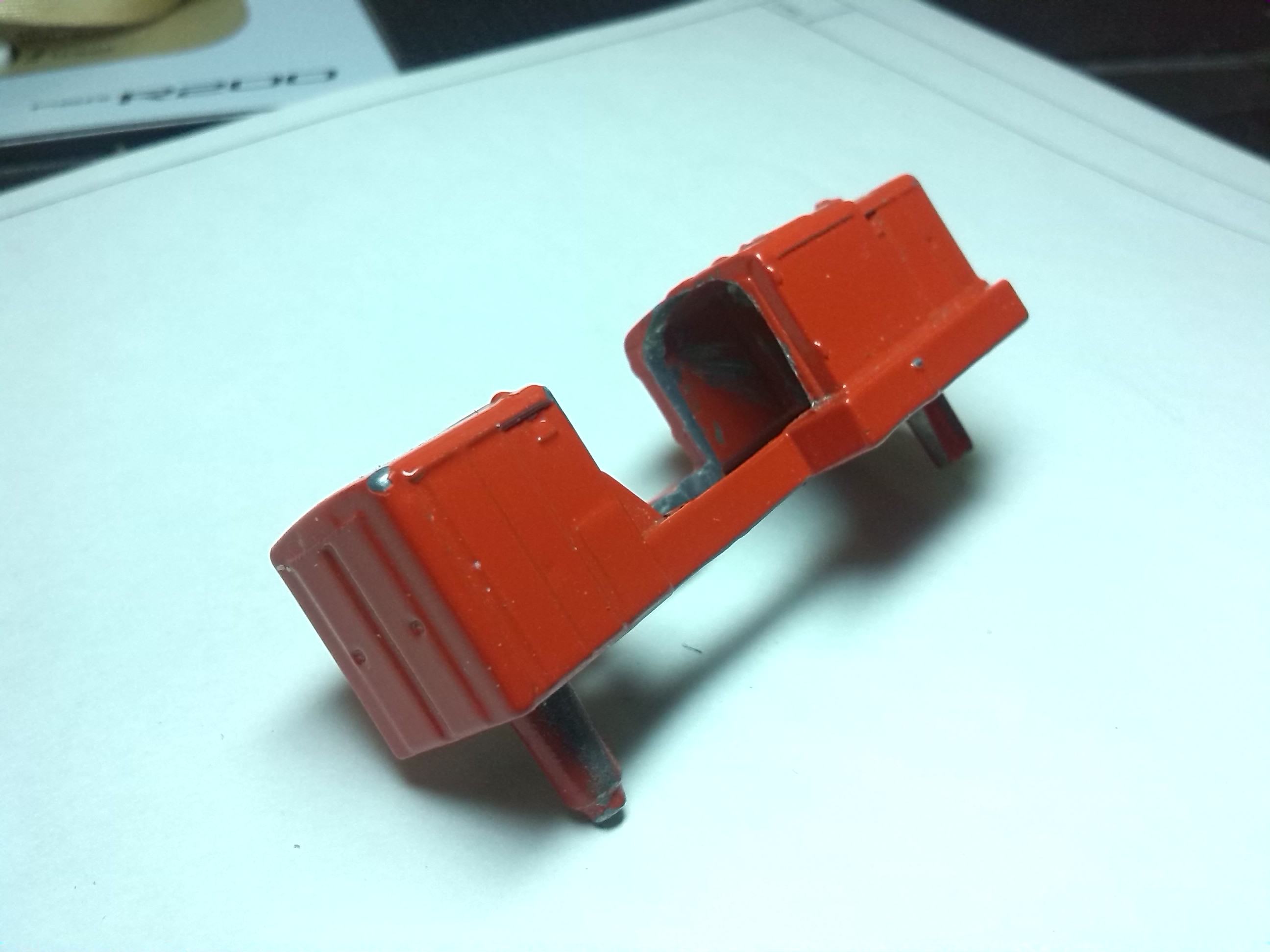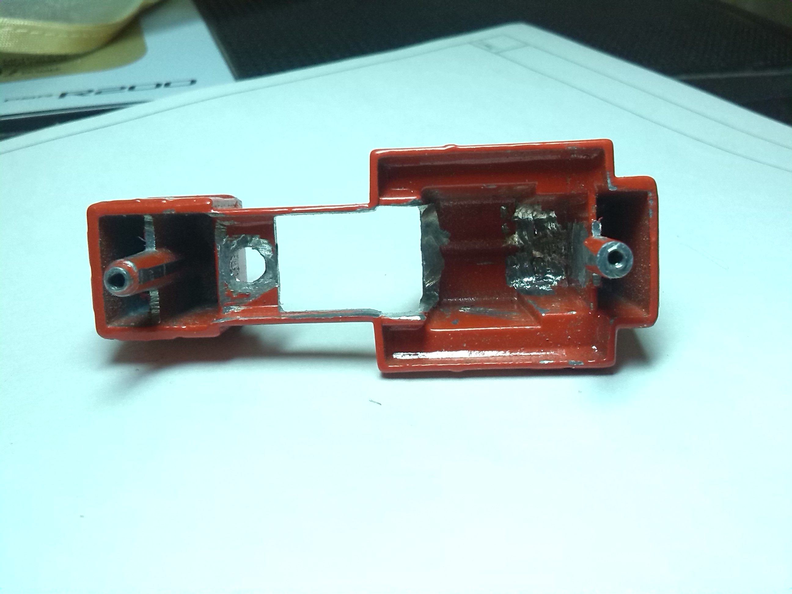 Кабина была прикручена к корпусу двумя шурупчиками снизу. На 3 фото видно отверстие для крепления кабины, второе - с правой стороны вместе со стенкой правой части корпуса уже выпилены. Это нужно для установки внутри корпуса мотора.