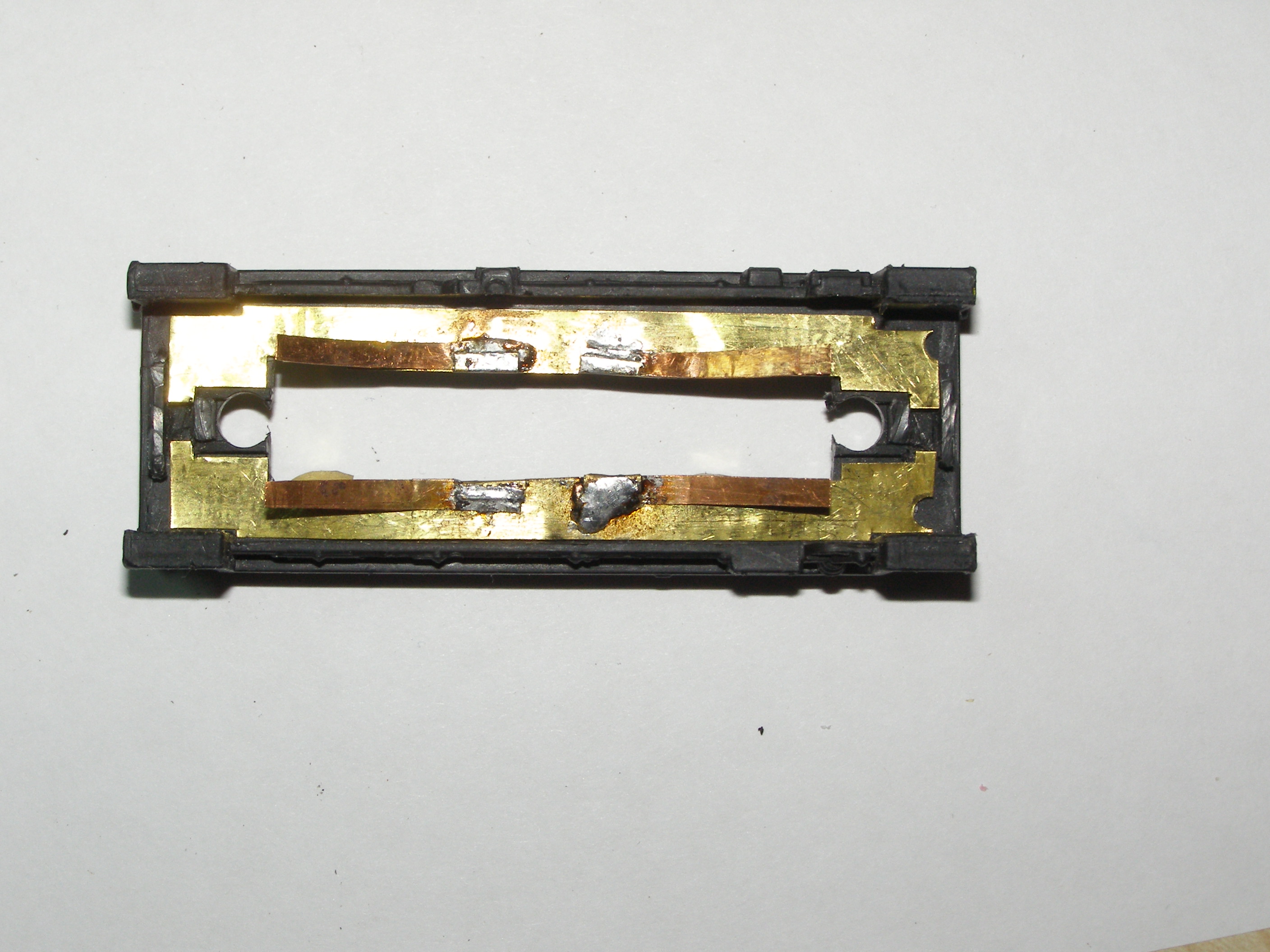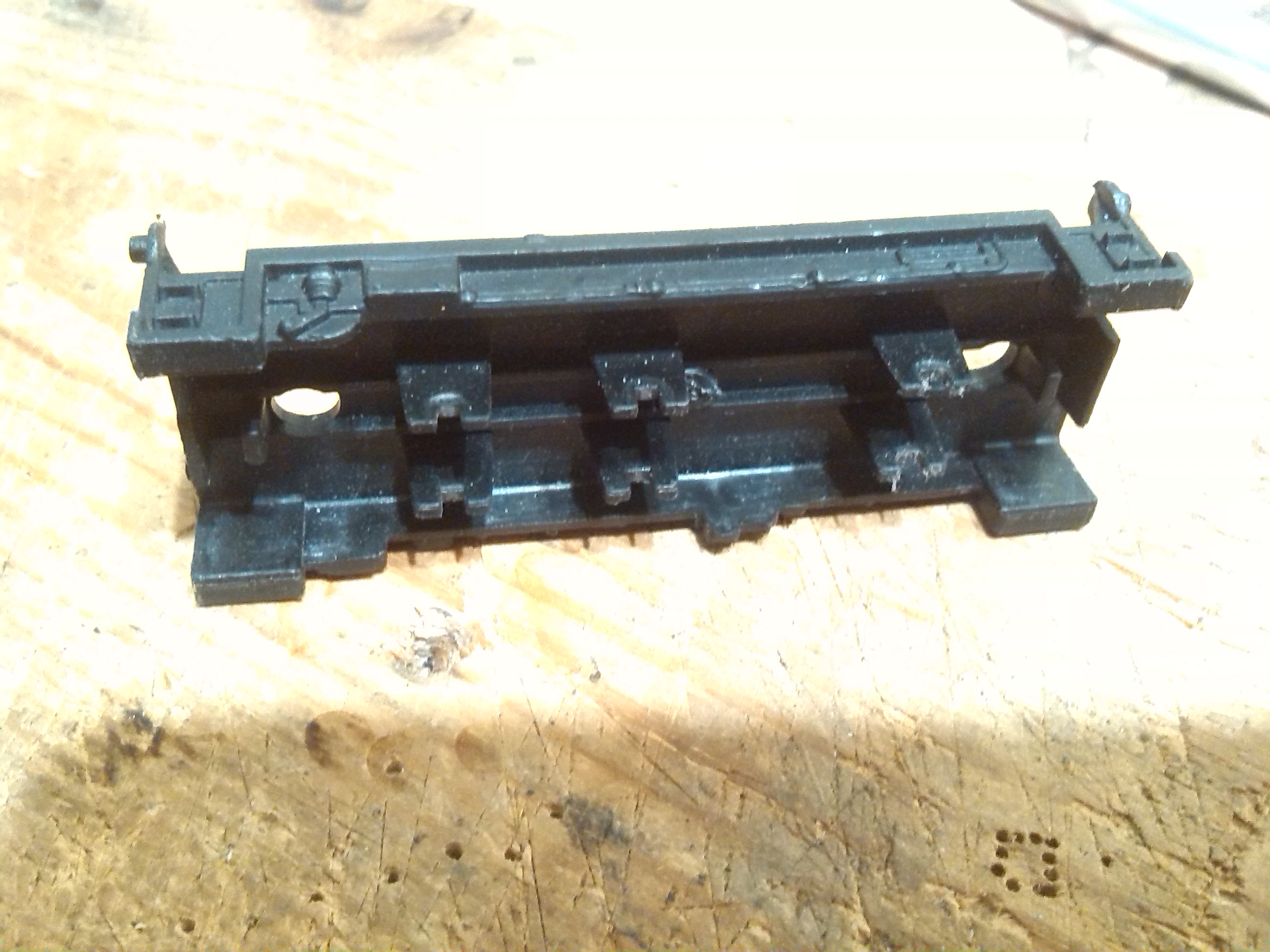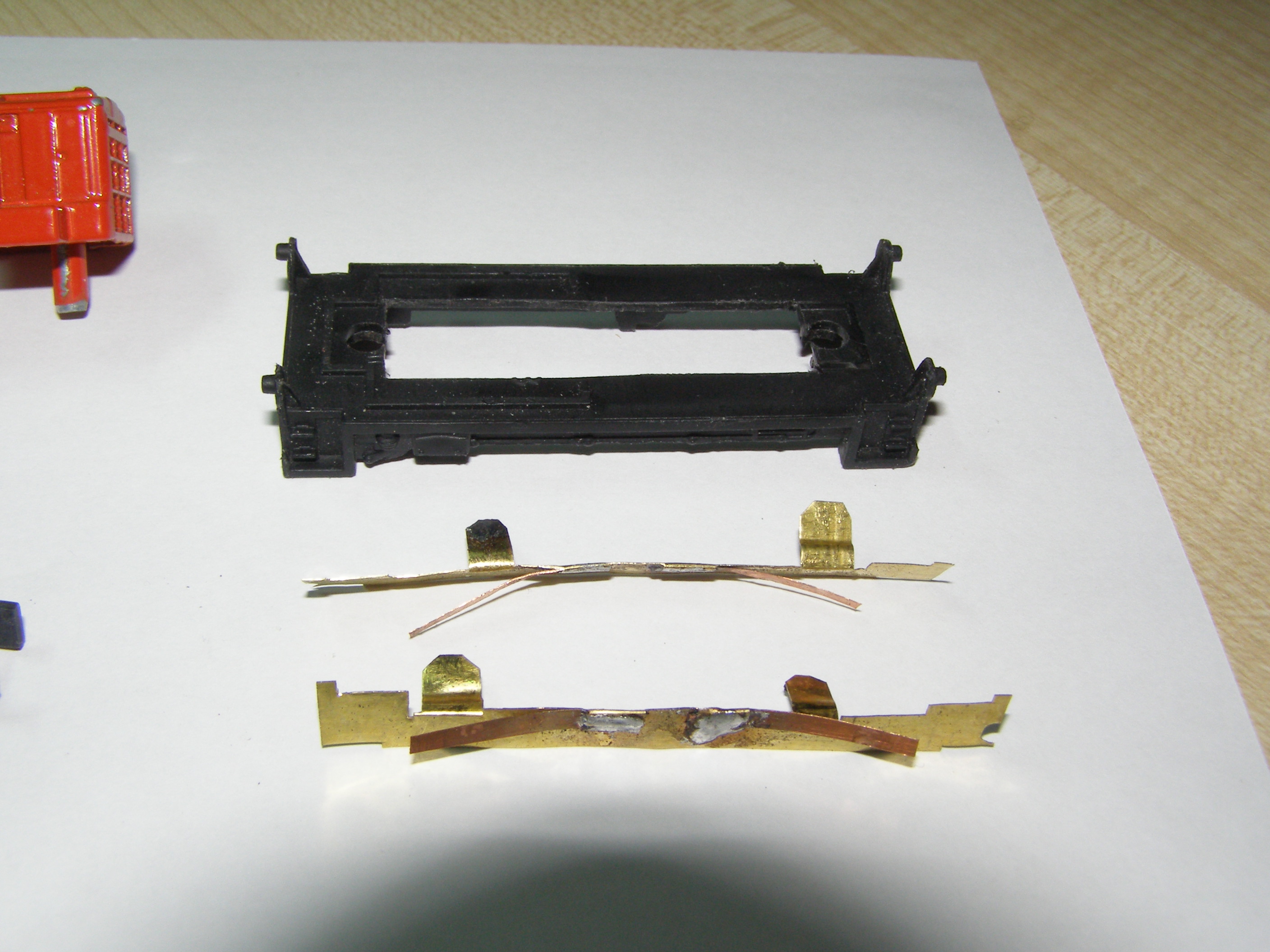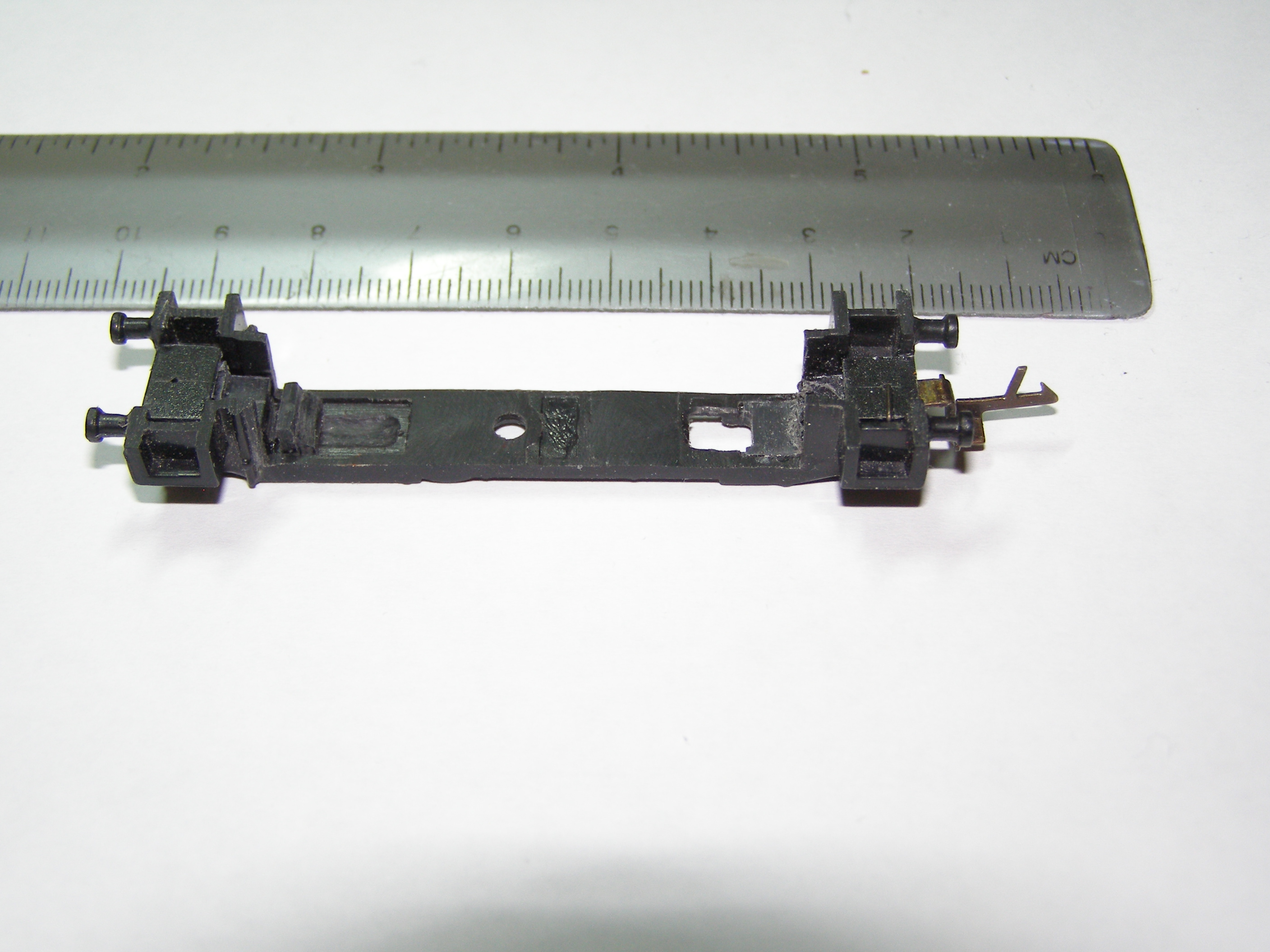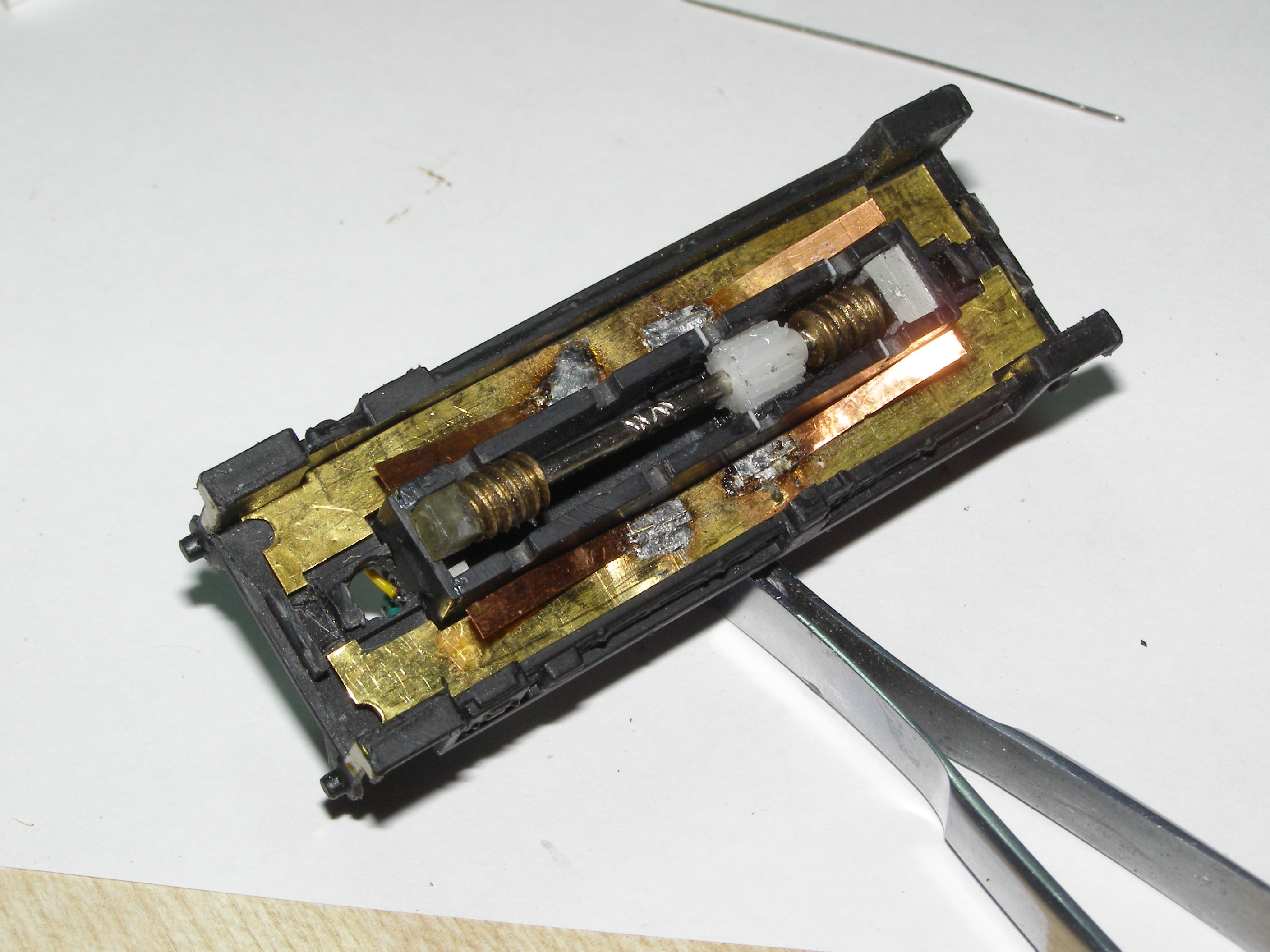 Из-за того, что рама локомотива сделана из поливинилхлорида, который дихлорэтаном ничем не клеется, пришлось в ней вырезать отверстие для установки тележки, на которой будет крепиться двигатель, редуктор, привод на колеса, контакты. Еще одна причина - сохранить текстуры рамы.