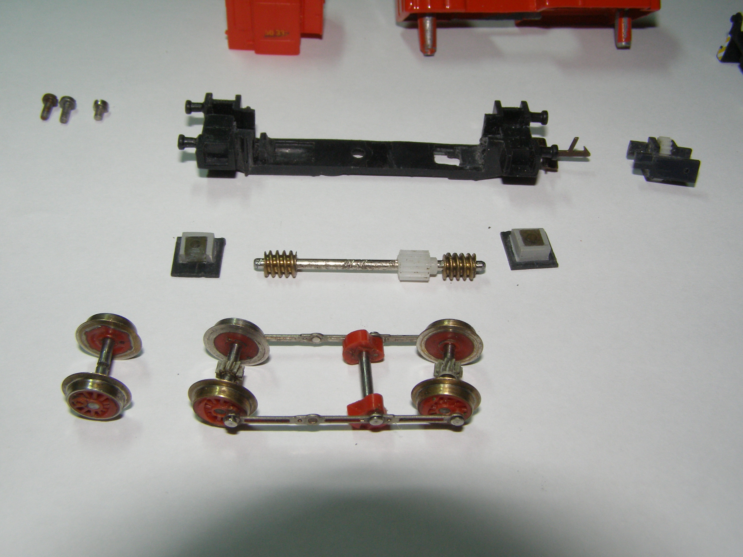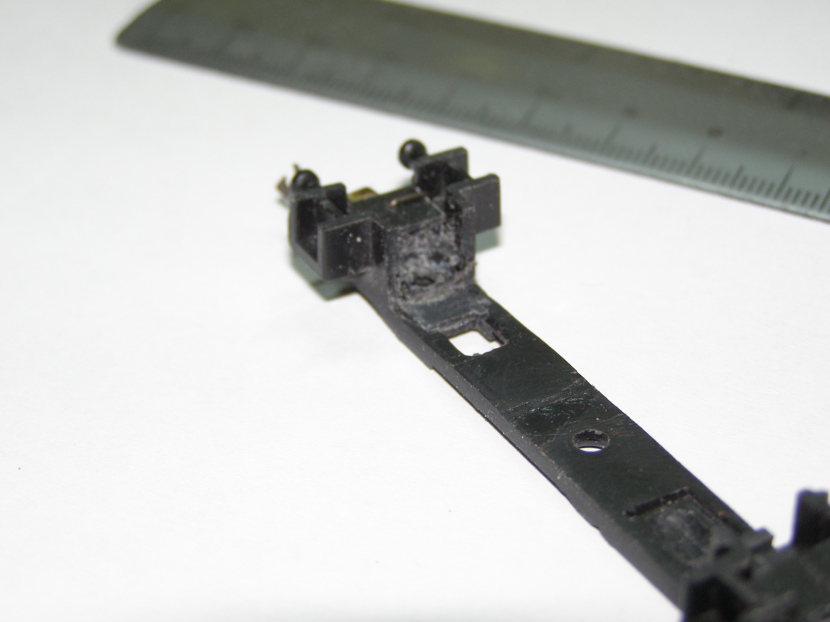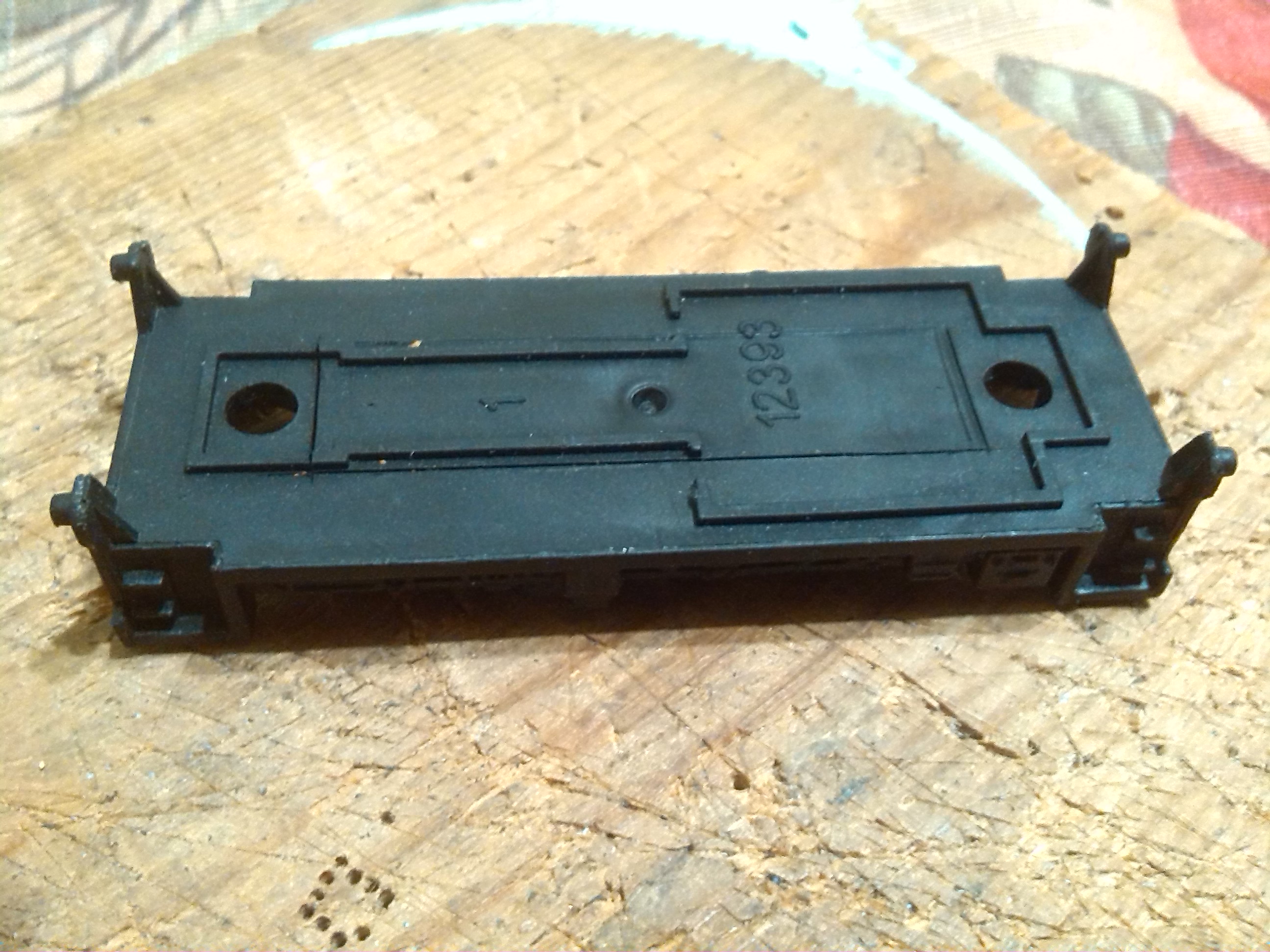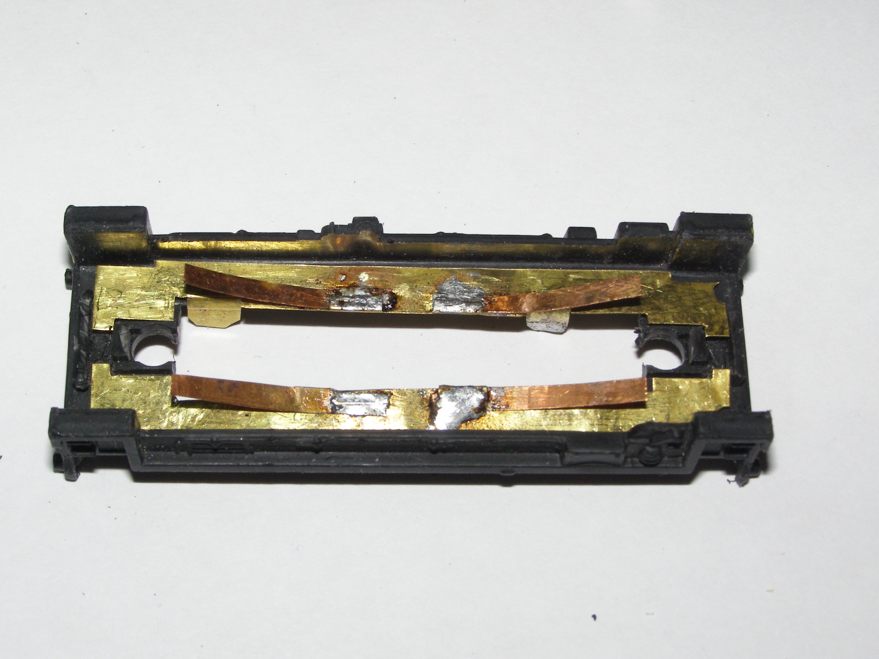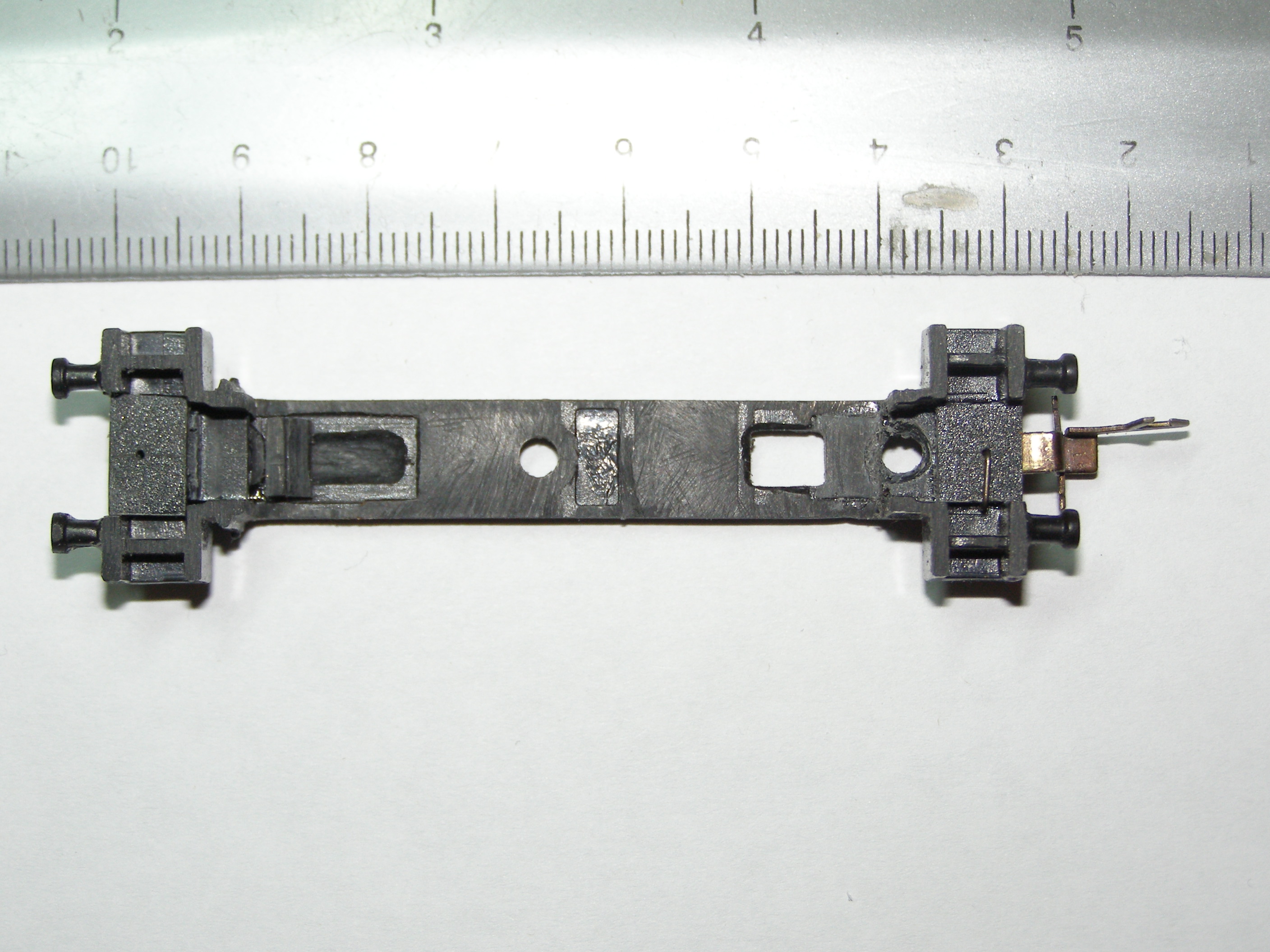Из-за того, что рама локомотива сделана из поливинилхлорида, который дихлорэтаном ничем не клеется, пришлось в ней вырезать отверстие для установки тележки, на которой будет крепиться двигатель, редуктор, привод на колеса, контакты. Еще одна причина - сохранить текстуры рамы.
