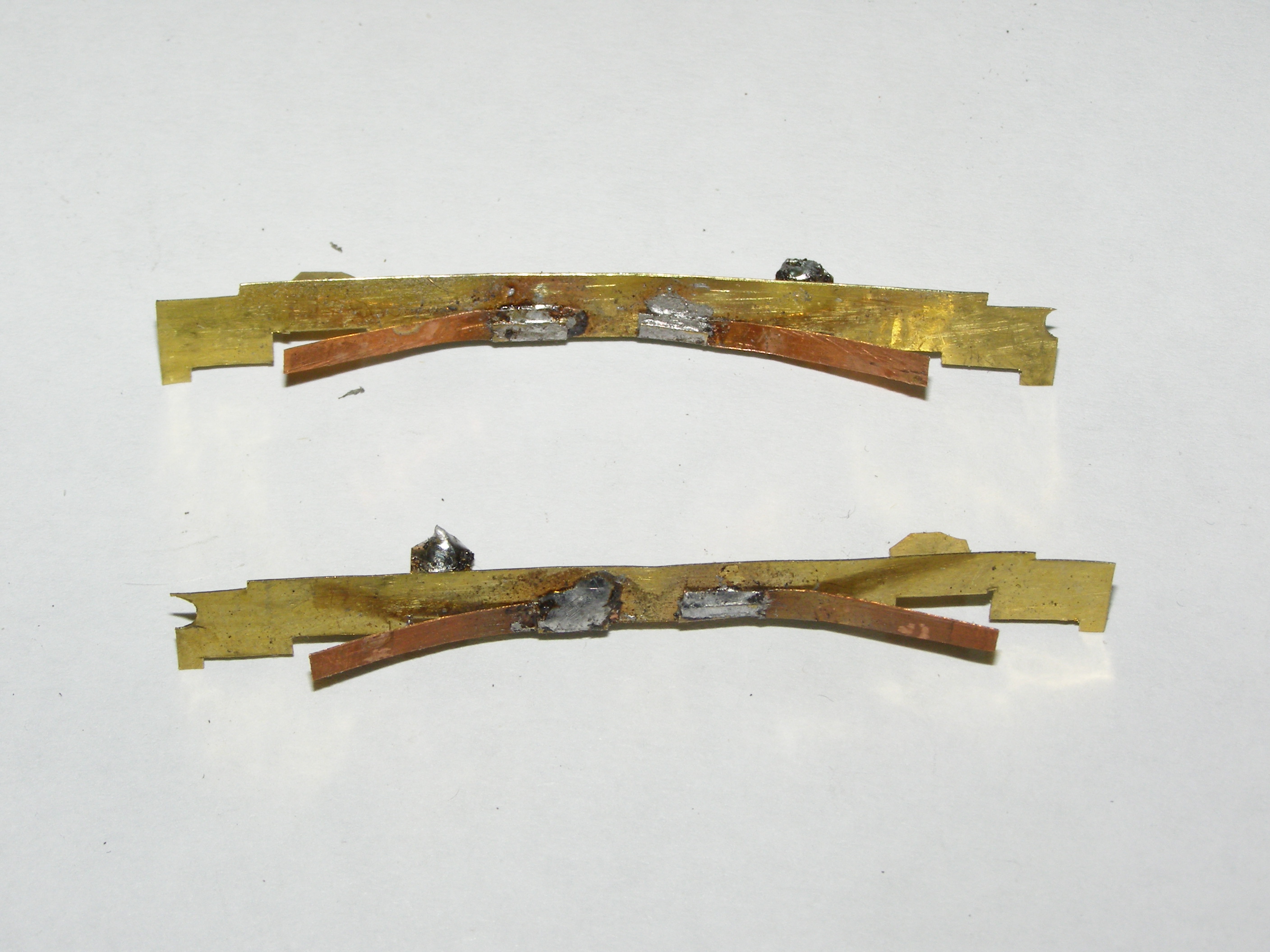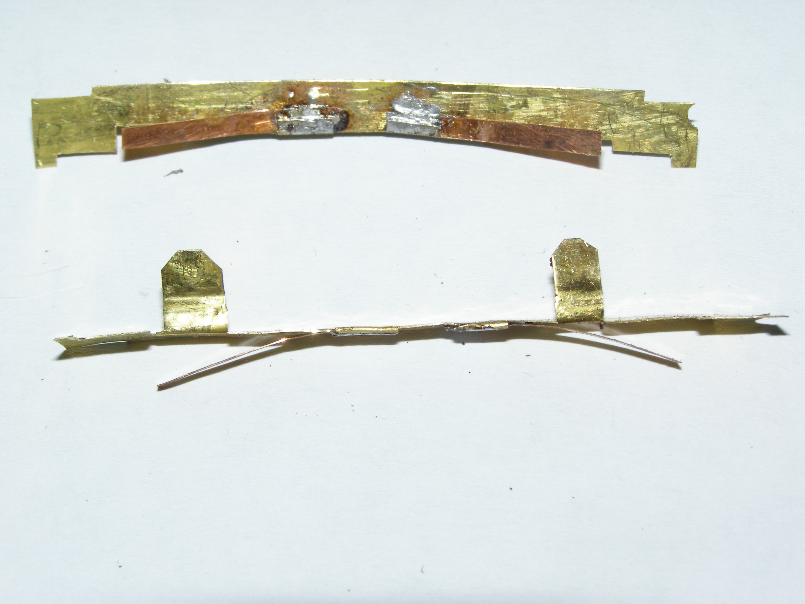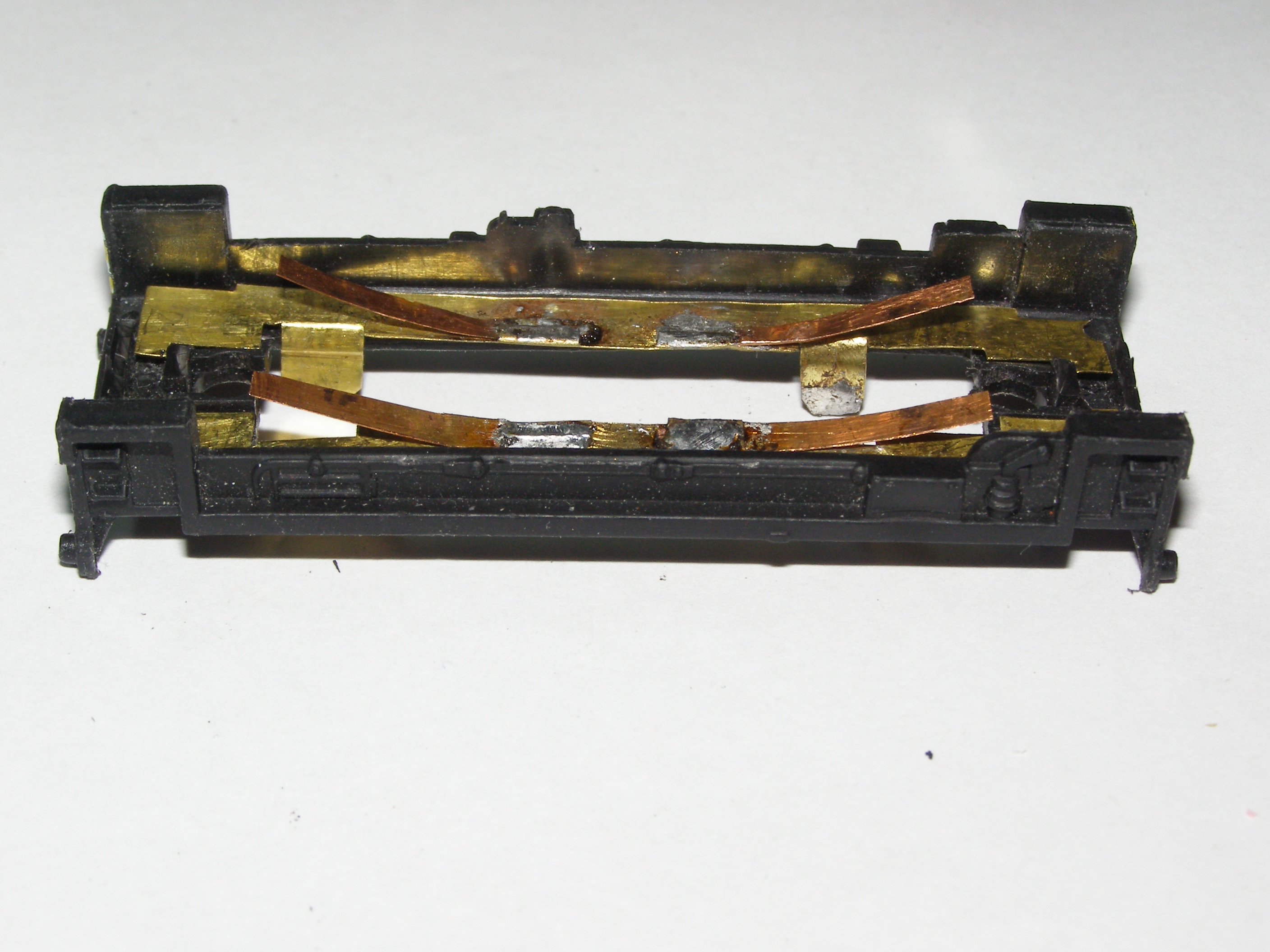 Закрепляем контактные платины на тележке, загнув широкие концы и припаиваем провода от мотора