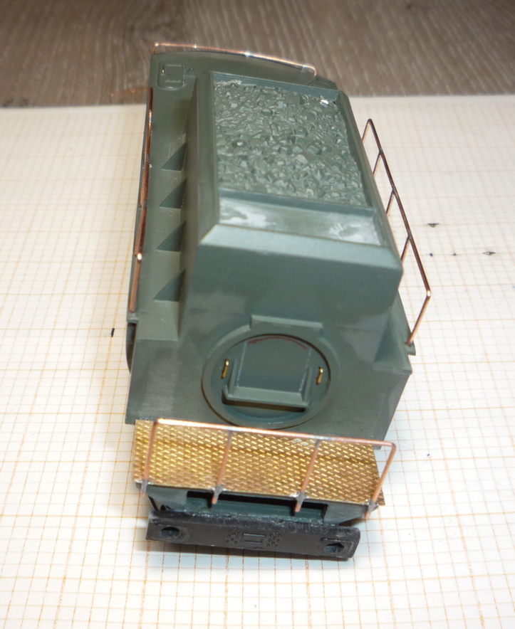 С тендера снял все приклеенные детали, с левой стороны срезал трубу, снизу - всю проводку, лестницы спереди и сзади, трубу сзади справа.