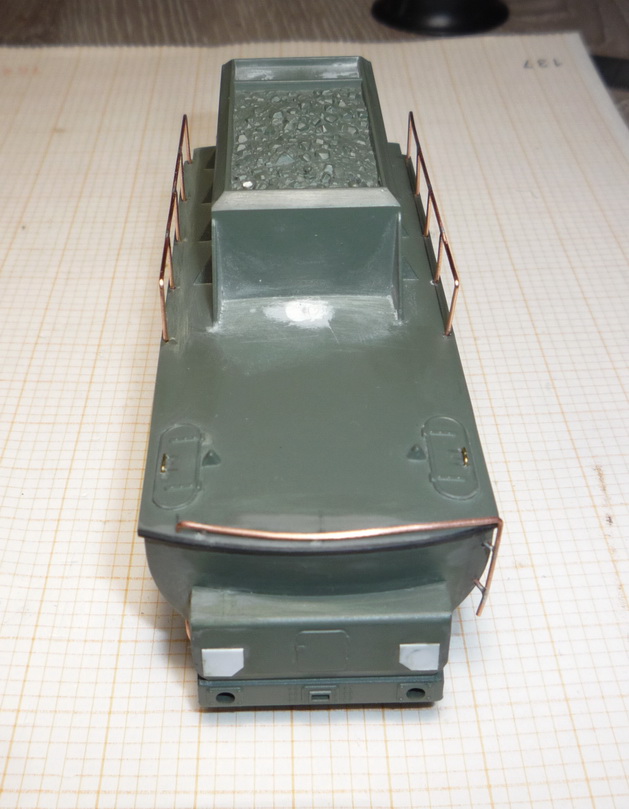 С тендера снял все приклеенные детали, с левой стороны срезал трубу, снизу - всю проводку, лестницы спереди и сзади, трубу сзади справа.