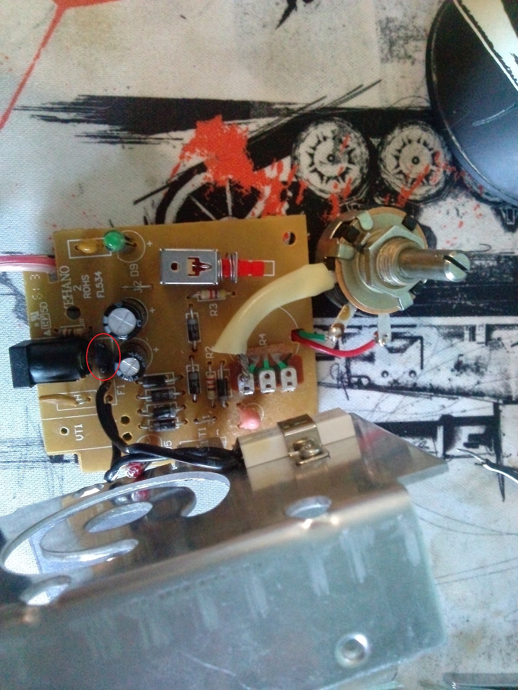 Недавно раскурочил свой блок питания, который благополучно перестал работать, разбираться оно нормально не хотело, поэтому пришлось отодрать с мясом регулируемый резистор (по другому было никак :oops: ). Заменил LM317 припаял регулятор от старого советского магнитофона и блок заработал, правда регулировка скорости теперь очень паршивая, идет рывками и либо медленно, либо сразу быстро, но ничего, для проверки самоделок пойдет, на постоянной основе будет цифра. Еще такой момент, на плате блока, есть сгоревший элемент (обозначил красным овалом на фото), который я не могу идентифицировать, склоняюсь, к тому, что это был конденсатор, а Вы как думаете?