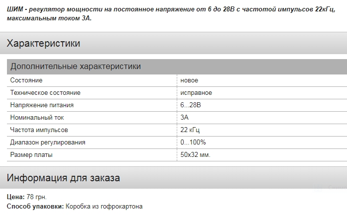 При выборе исходил из того, что 3А вполне соответствуют нашим потребностям, частота 22 кГц выходит за звуковой диапазон и не будет столь часто упоминаемого при обсуждения ШИМ свиста. Скважность 0-100% обеспечивает полную регулировку от стопа до максимального хода. Следует заметить, что есть аналогичные устройства со скважностью, например, 20-95% и проч. Для наших потребностей они не подходят.