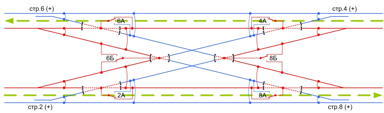 Така штука називається "перехресний з'їзд". От тут на роботі прикинув як все мало би виглядати. Одразу скажу, що на справжній залзниці стрілки займають тільки такі положення, як на малюнках. Одночасний перехресний напрям руху виключається положенням стрілок. Тобто якщо одна пара стрілок 2/4 (6/8) стоїть в мінусовому положення (по з'їзду), то інша пара 6/8 (2/4) стоїть в плюсовому положенні. Пунктиром показані повністю ізольовані частини з'їзду, які при можливості і бажанні можна живити в залежності від положення стрілок. Наприклад, за допомогою поляризованих реле, якщо стрілки переводяться імпульсно. Для живлення хрестовин глухого перетину використовується додаткова пара контактів однієї пари стрілок 2/4 або 6/8. Тільки уважно розгляньте положення контактів, якщо будете живити хрестовини. Полярність показана умовно. Плюс - червоний, мінус - синій. Або навпаки, кому як подобається. Струмоподіл на малюнках відбувається по горизонтальній осі глухого перетину, тому необхідно забезпечити можливість підключення паралельних колій до одного джерела живлення при маршрутах по з'їзду. Для незалежного паралельного руху і так зрозуміло, що потрібно два джерела живлення.