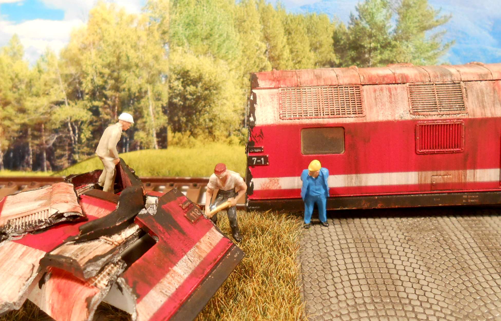 Вот Гюнтер,Вольфганг и Клаус кропотливо крошат махину на куски. Конечно на макете добавлю грузовик,лестницы,газовый резак.