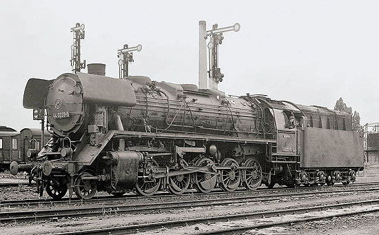 Эти две копии взяли экспериментальные числа М 02 М 02 1004 и 1005. топка из первых была сделана из сплава с 3% никеля, а второй стали St 44. Способ был выбран соединение двойное расширение из-за трудности обработки высокого давления 25 бар в одну ступень. Баллоны высокого давления, расположенные внутри, атаковали вторую ось. Эти испытания, эти две машины, выполненные в сочетании с турбиной шесть других моделей высокого давления, привели лишь к одному выводу: Чем больше давление в цилиндре был более экономичным расходом топлива. Однако высокая стоимость обслуживания и производства рекомендуется оказывать давление на средних значениях далеко от экспериментально апробировано от 60 до 120 бара. Было показано, что предел, который может быть достигнут с конструкцией котла Stephenson с трубками, составляет 20 бар. Оба локомотивы были повреждены и подвергаются воздействию сильных изменений в этом году во время интенсивных испытаний, которые были представлены в лабораториях LVA Грюневальда. После замены водяных камер на заводе Henschel были получены впечатляющие данные по сравнению с 43 001 и 44 011 и 44 005 с увеличением мощности до 2450 л.с. (*), а потребление было настолько низким, что оно составляло запись для поршневых локомотивов. В 1935 годе давление единиц было снижено до 20 бара и в 1939 году до 16. 44011 остался в Западной Германии после войны и не был в обслуживании до декабря 1950 года в Bw Корнвестхайме. 44 012, который оставался в восточной части, работал в качестве тормозной машины в Bw Halle до марта 1962 года.