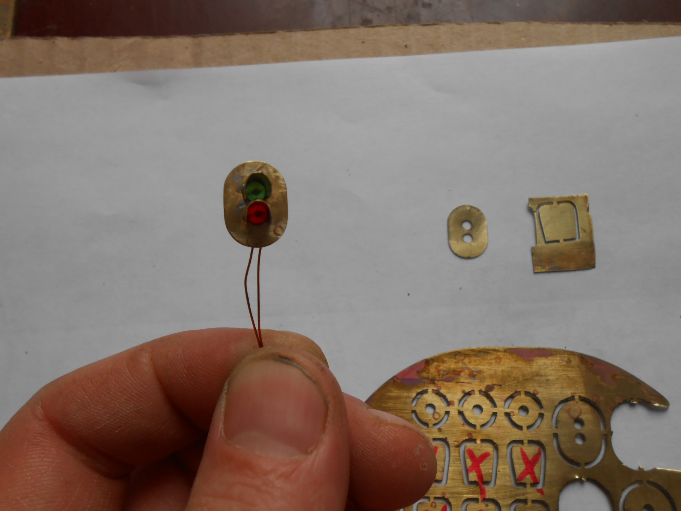 Сегодня сделали заборы и нечто похожее на немецкие светофоры (переразмерил головку, надо уменьшить на 1,5 мм по ширине и 2 мм по высоте, а еще лучше под смд-диоды делать). Вытравлено на латуни 0,15мм формата А5.