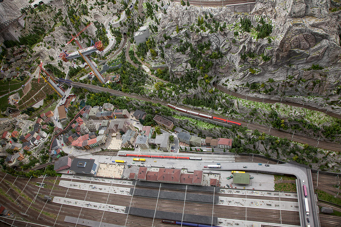 А сейчас немного фотографий уже 2011 года из швейцарской зоны макета. В Тессине, в итальянской части Швейцарии, есть город Беллинцона (Bellinzona). Не знаю, почему макетчики Miniatur Wunderland'a не сохранили оригинальное название города, а трансформировали его в Belloszona. Скорее всего, захотели вложить что-то свое в данную местность, а чтобы не было упреков ы несоответствии с реальными объектами города, поменяли название. Чуть выше города и одноименного вокзала расположены руины средневекового замка, где по нажатию соответствующей кнопочки на бортике макета можно увидеть настоящие рыцарские турниры, средневековые танцы и игры в замке. Очень интересен с точки зрения индустриального моделизма цементно-бетонный завод компании Holcim, где, опять же нажатием кнопочки, можно запустить весь технологический процесс производства бетона. Высоко над всем этим среди заснеженных швейцарских Альп возвышается красавец пик Матерхорн, визитная карточка не только Швейцарии, но и Альп вообще. К сожалению, на данных фотографиях замок и завод, (а также Маттерхорн), практически не видны, так что будем смотреть на вокзал и город Belloszona