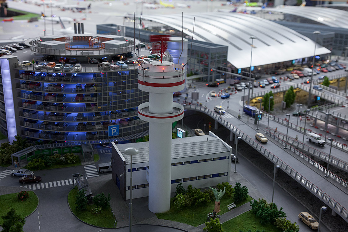 А теперь несколько фотографий 2011 года, когда я впервые увидел в МиВуЛа аэропорт. Точнее, сначала не увидел, а услышал: имитация всех звуков живого аэропорта встречает посетителей еще до того, как они увидят летное поле - нежно "свистят" турбины выруливающего на стоянку Аэробуса, воют сирены спецтехники, грохочут двигатели взлетающего тяжелого боинга или даже АНа, ТУ и Конкорда ( АН -124 "Волга-Днепр", ТУ-154 "Аэрофолот" и Конкорд "Бритиш Эруейз" действительно присутствуют на макете, периодически взлетая и приземляясь). Естественно, что звуки, издаваемые турбовинтовым Констеллейшн от "Люфтганзы" середины прошлого века и сверхзвуковым Конкордом - абсолютно разные, что с точностью реализовано в "озвучке" аэропорта. Надо сказать, что это не реальный, а вымышленный аэропорт вымышленного города Кнуфинген, находящегося на макете тут же, рядом. Отсутствие привязки к конкретному аэропорту развязало руки моделистам МиВуЛа и позволило им не копировать современные аэропорты с весьма скудным парком самолетов, а показать весь спектр авиации, в том числе и те типы самолетов, которые вряд ли могли бы встретиться во времени и пространстве - Конкорд и ТУ-154, например, покинули европейские аэродромы до того, как на них появился А-380 и B-787 Дримлайнер, а в аэропорту Кнуфинген они мирно соседствуют. А еще в углу летного поля на выставочной стоянке стоят самолеты типа Юнкерс-52 и Дуглас-3, расширяя и без того широкий парк представленных самолетов. В конце концов копирование любого аэропорта было бы невозможно из-за ограничения по площади, да и Миниатюр Вундерланд никогда не стремился к точному копированию небольших фрагментов ландшафта, а пытался охватить весь мир. Именно поэтому он популярен у миллионов туристов, а не только у педантичных моделистов масштаба HO, для которых историческая достоверность приоритетна.