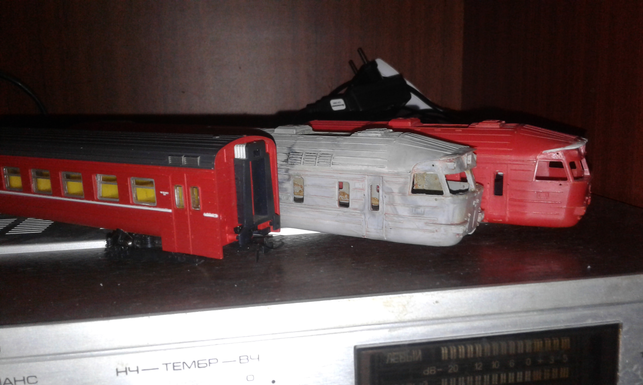 Добрый вечер форумчане. Год назад после работы с ЭР9 меня начал интересовать вопрос с ДР1 . Мной было преобретено три вагона один из которых был перепилен пополам ножовочным полотном. После годовой работы получилось вот такое.Сильно прошу не судить за техническое видео .У модели отутствуют лестницы в кабины и антенны.