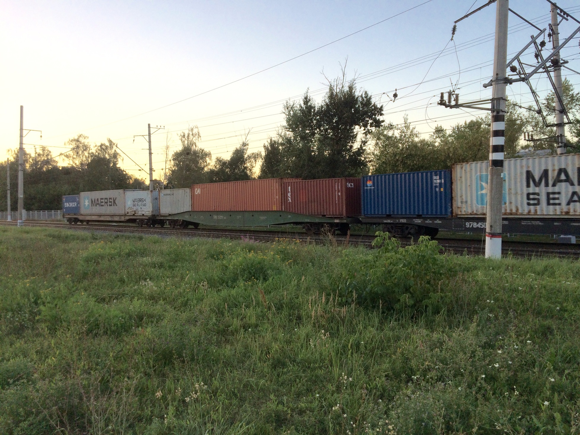 Поймал под занавес контейнеровоз. Старшая 79 платформ вроде бы насчитала. Такого разнообразия платформ, я ещё не видел. В хвосте была очень занятная платформа с высокими и фигурными бортами. Кто знает, дайте наводку на её номер. Спасибо заранее.