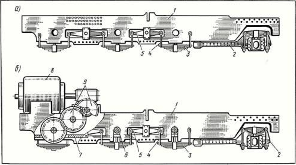 а — без привода; б — с приводом; 1 — рама; 2 — бегунковая тележка; 3 — рессоры; 4 — рессорные подвески; 5 — балансиры; 6 — оси; 7 — прижимная пластина; 8 — электродвигатель; 9 — редуктор