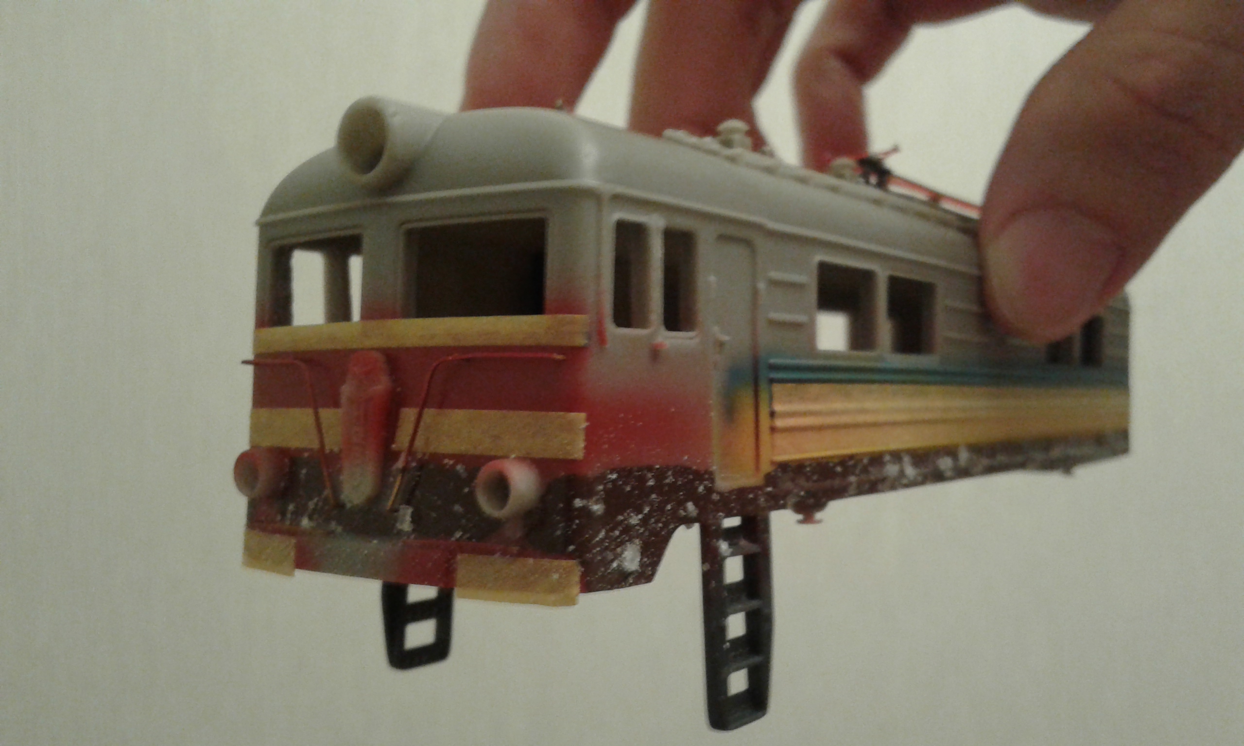 Всем привет! Сегодня закончил свой ВЛ8. Работать начал над ним в июле. Обмоторен двумя ходовками Роко е44. Но вот из-за того, что взял старые ходовки, которые были изрядно потрепаны, пришлось сделать одну ходовую секцию, собранную из запчастей этих двух. Второй кузов (так сказать правильнее, т.к. лок НЕ 2-секционный), не моторный. В итоге всё равно ходовые качества модели меня не устраивают... Больше никогда не буду брать старые ходовки. Следующую модель обмоторю новыми. Позже остановлюсь подробнее на некоторых этапах сборки ВЛ8: как состаривал, чем, скину фото процессов.