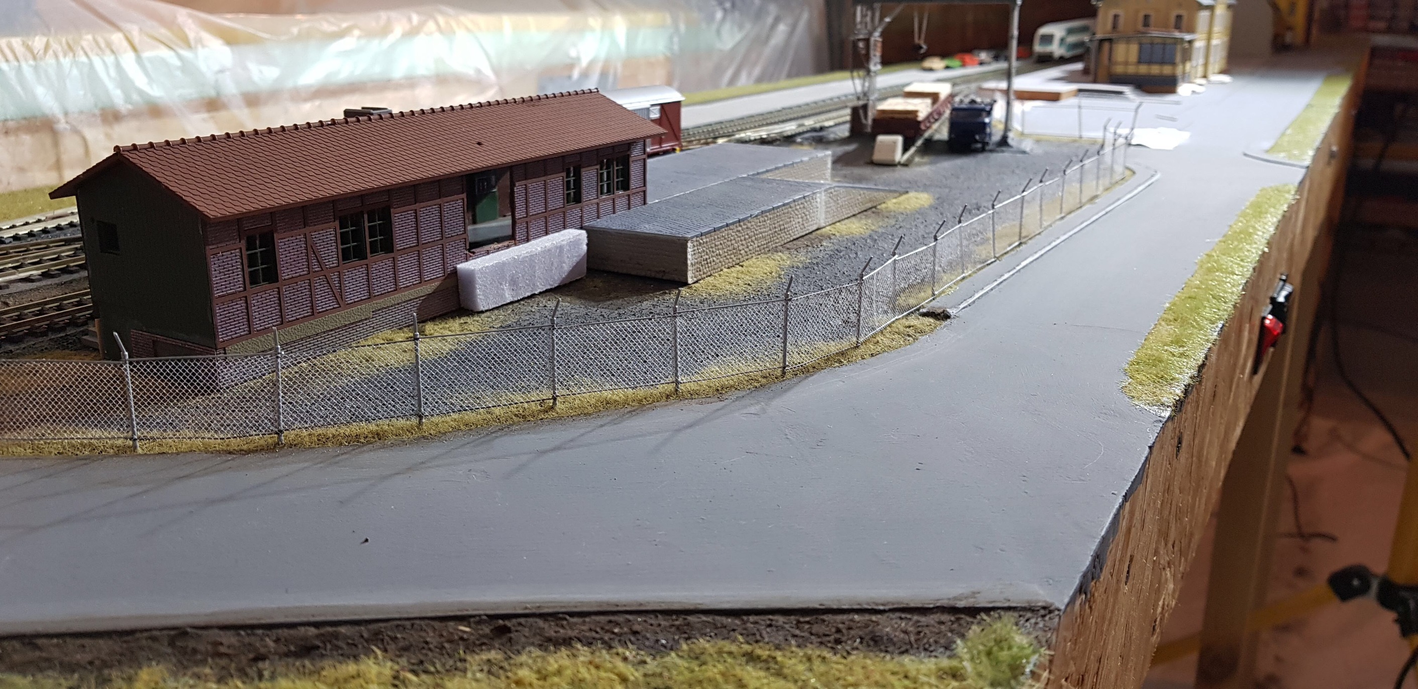 Ограда производства Walthers, стойки и прутики красил маркёром, в комплекте идёт кусок ткани для имитации сетки. Ткань не красил, на ограде выглядит как металлическая.