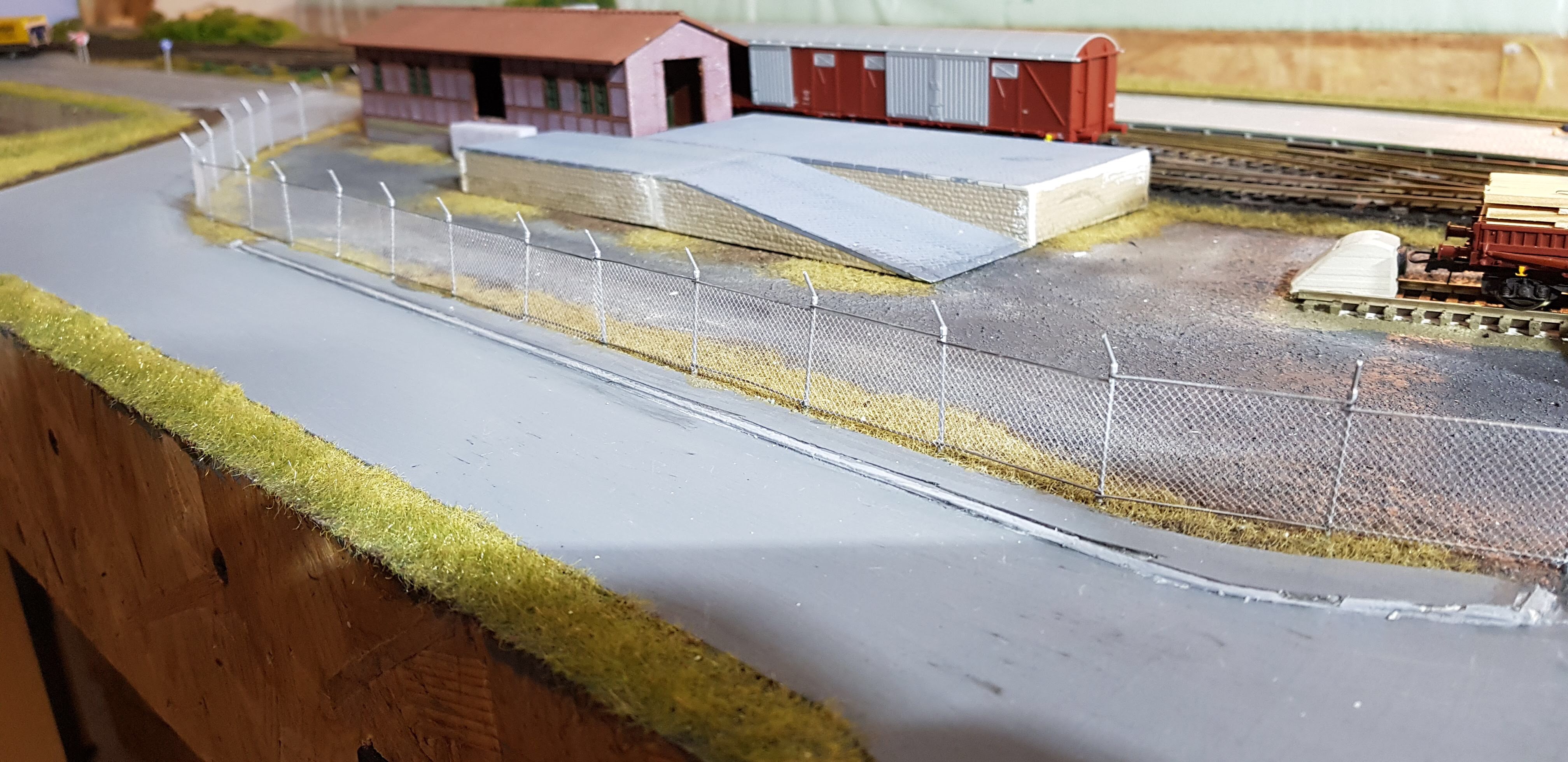 Ограда производства Walthers, стойки и прутики красил маркёром, в комплекте идёт кусок ткани для имитации сетки. Ткань не красил, на ограде выглядит как металлическая.