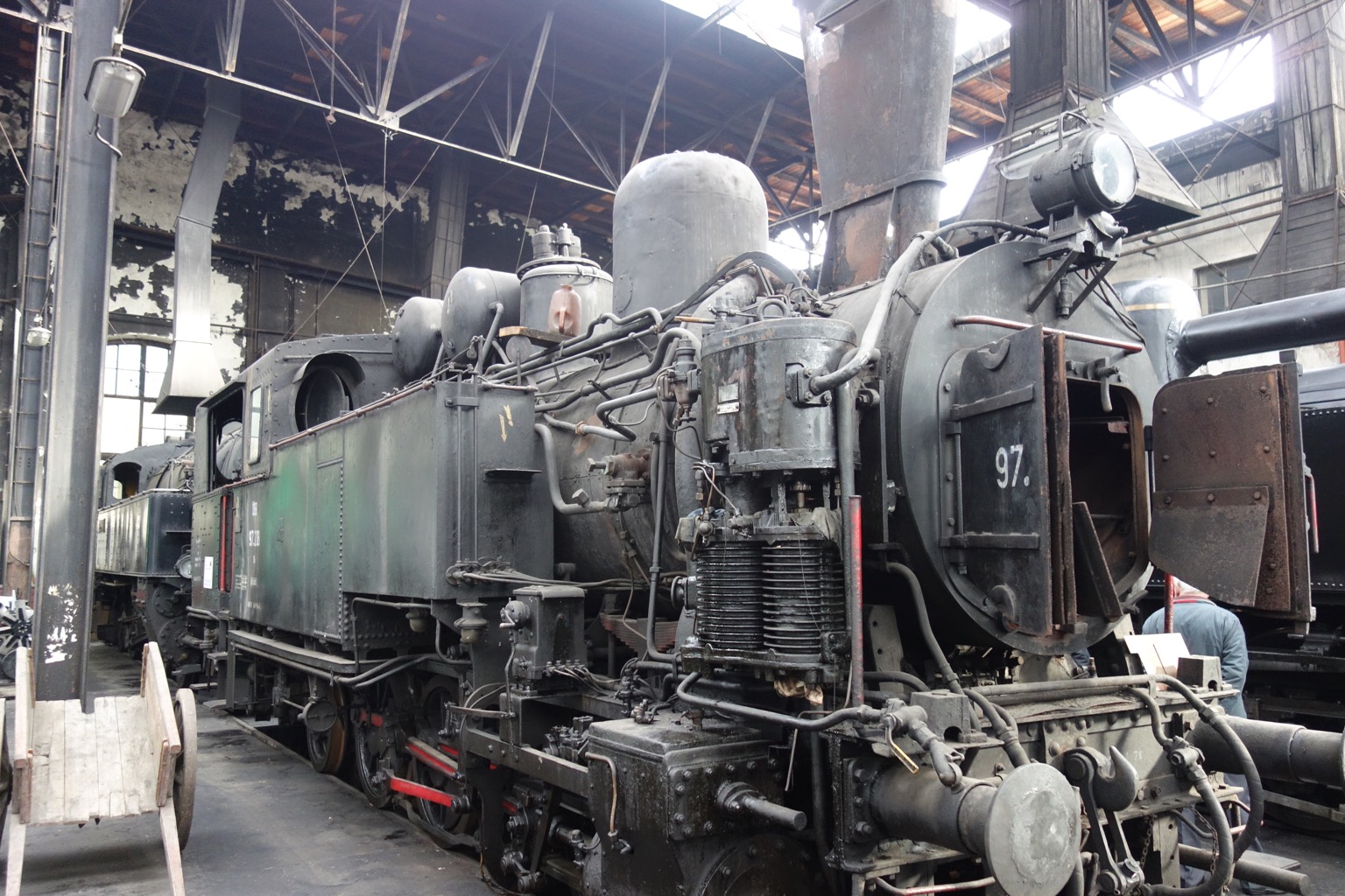 Ну вот мы и добрались до экспозиции под крышей. На самом деле, это не очень похоже на экспозицию в традиционном смысле, скорее нам показывают, как восстанавливают и обслуживают подвижной состав. Вот, например, 109.13