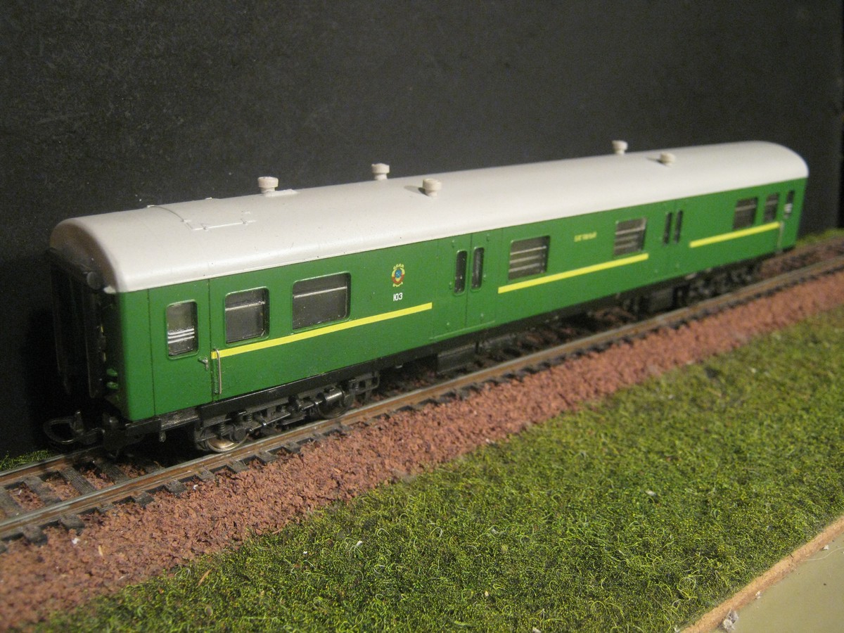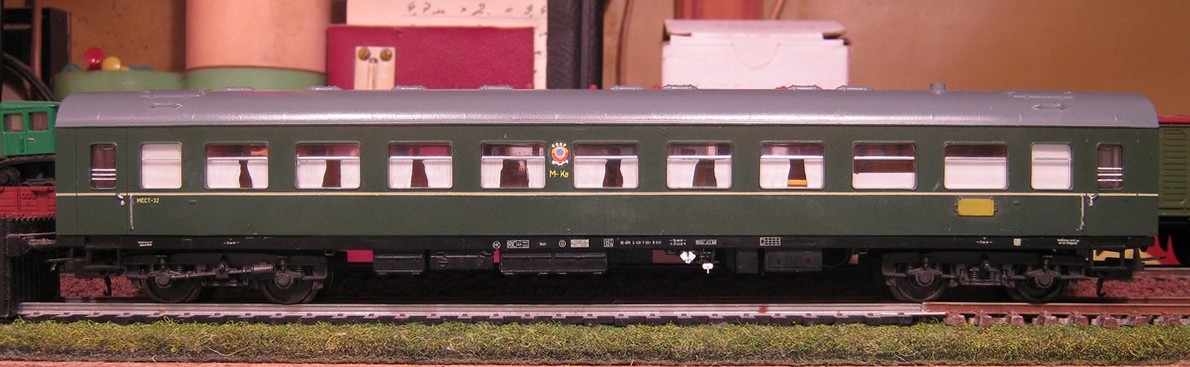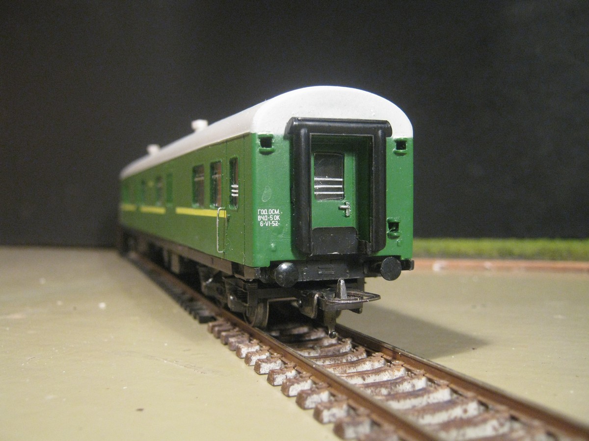 Даже не по мотивам, а вообще фантазийная отсебятина. У меня такого добра есть. Достаточно давно попались практически даром несколько вагонов INTERNATIONAL без тележек и иногда о них вспоминаю. С багажным, например, пытался что-то реально сделать - закруглял торцы, переделывал переходные двери тамбуров, "грибочки" на крыше высаживал. Даже что-то начинал с концевыми огнями. А вот на вагоне II класса с буфетом лишь стёр спиртом явно читаемые надписи на латинице, повесил немного декалей СЖД и нарисовал водорастворимым акрилом шторки. На этих моделях отрабатывал свою методику минимального расстояния между вагонами без применения динамической сцепки. На R2 всё работает надежно и уверенно.Afess писав:по мотивам?