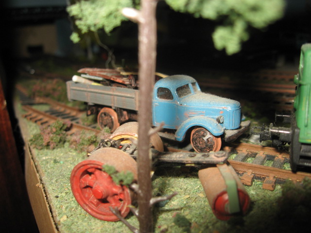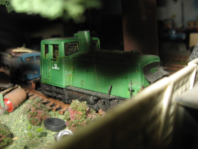 Начав фотать ЗИС на ЖД ходу решил уже показать и его "соседа", мотовоз МГ1. В основном это перекрас модели от Лилипут с небольшими изменениями. Пытался использовать его на маневрах в депо, но из за плохого токосъема мотовоз был отставлен от работы, отправлен в тупик где и стоит уже не один год. Там он отлично вписывается в тематику макета
