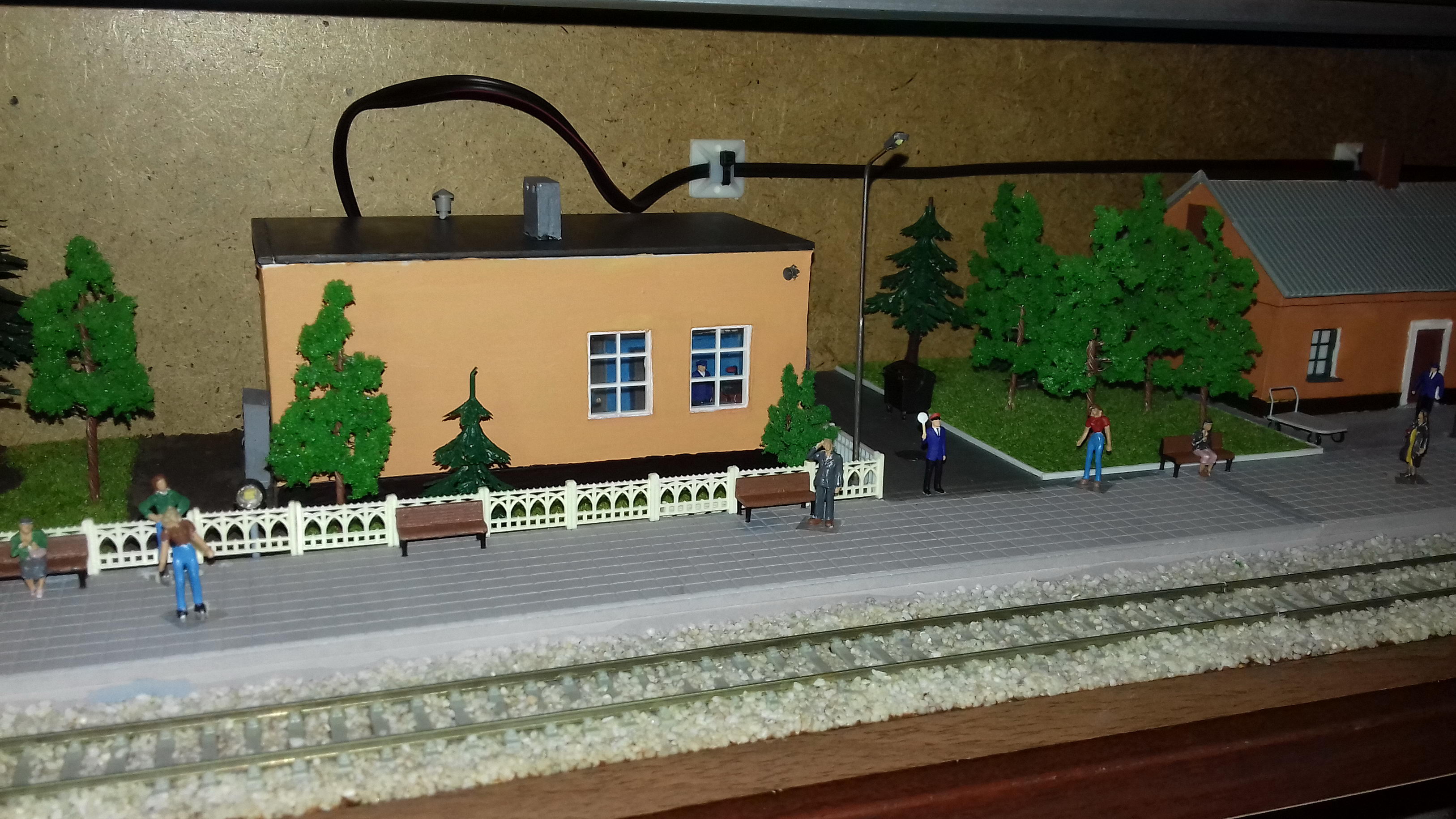 Общий вид: Выходной светофор и конец перрона: Пост ЭЦ. За основу взят немного переработанное здание поста ЭЦ станции Одесса-Застава II. Есть интерьер с подсветкой, фигурки ДСП и других работников: Здание вокзала. За основу взято здание вокзала станции Одесса-Восточная. Есть интерьер, подсветка, фигурки: Светофор и подстветка управляются 8-канальным DCC декодером на основе функционального декодера от Paco Canada, управление по локомотивному адресу и функциям. 4-канала - аспекты светофора, еще 4 - освещение перрона, прожектор осмотра состава на ходу, освещение поста ЭЦ, освещение здания вокзала.