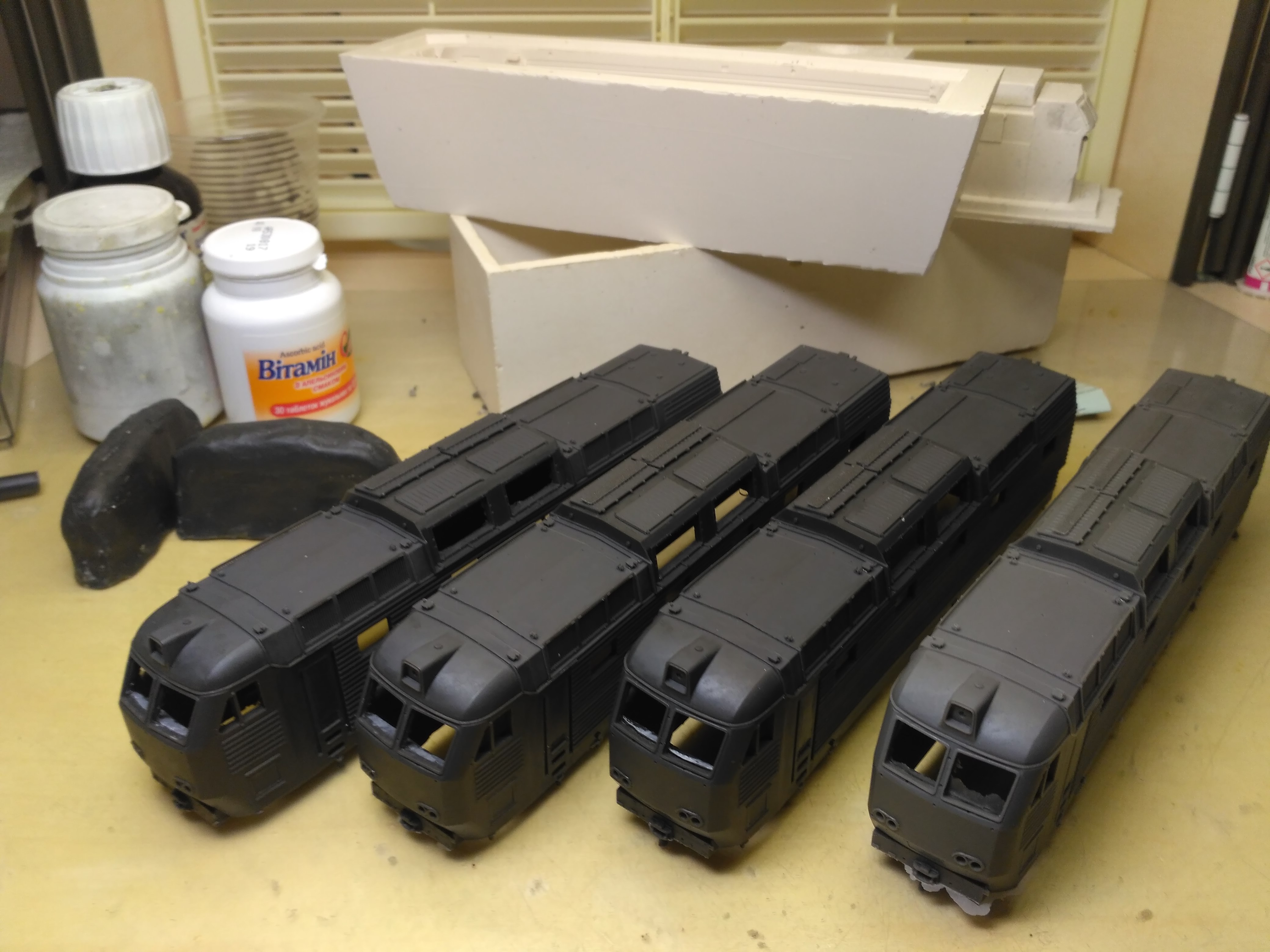 Была изготовлена рама под ходовую модель , а так же все крышевое - изоляторы, разъединители, резервуары с патрубками, антенны радиосвязи , новые батарейные ящики , внутрикабинное, имитаторы машинного отделения...и получился целый набор из более 50 форм...