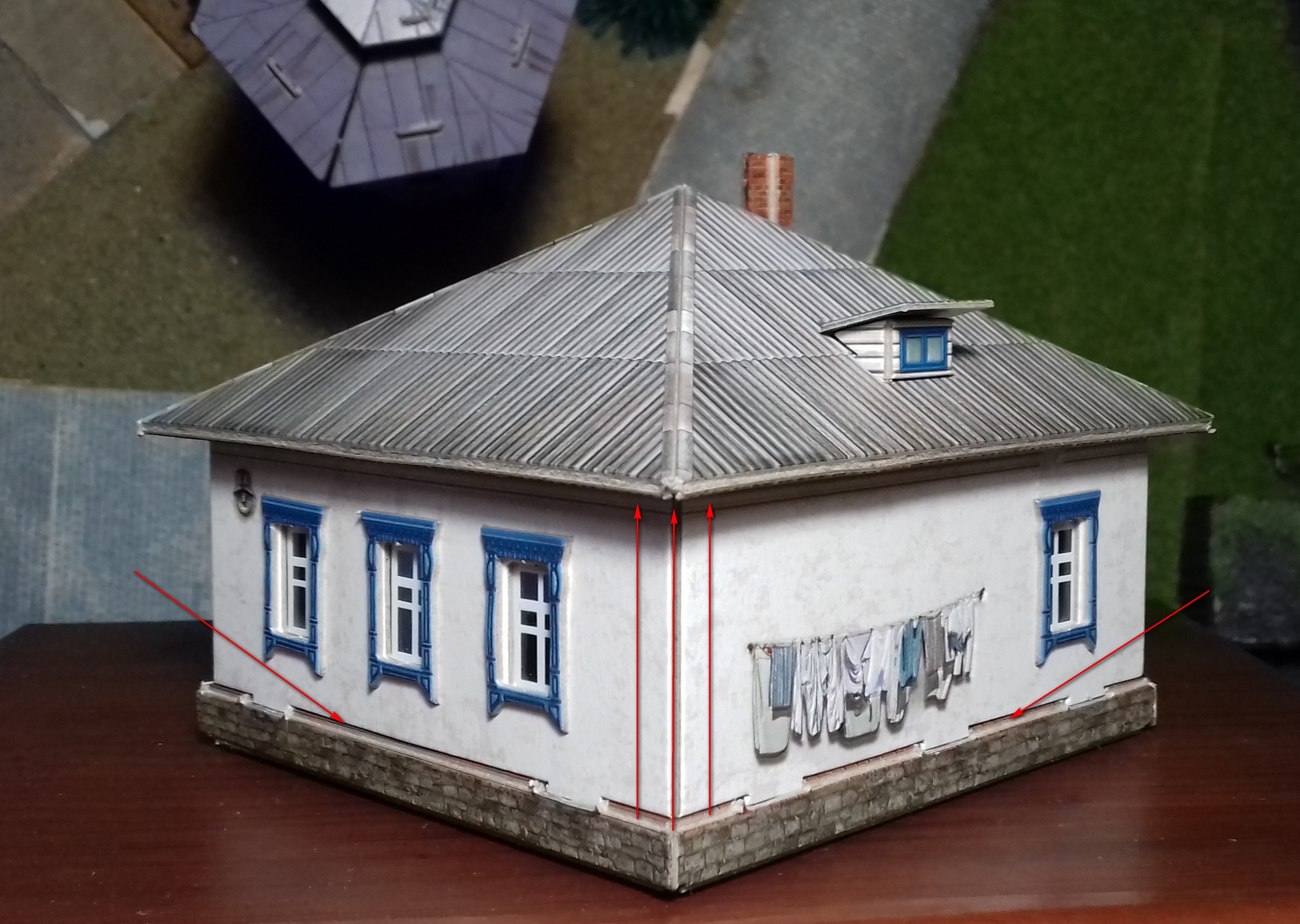 Шифер крупноват. Но тут та же ситуация, что и с углем в паровозных тендерах: если делать куски угля в масштабе, он будет выглядеть как черный песок. Шифер правильного размера есть на домиках "Умбум", и лично для меня он выглядит невзрачно.