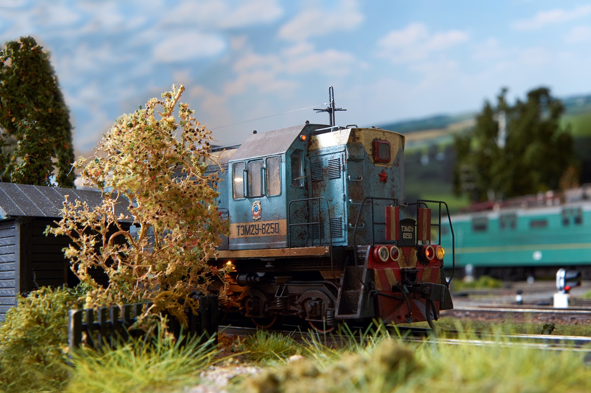 Ещё несколько художественных фото модели тепловоза ТЭМ2У-8250 со следами эксплуатации. Автор модели московский моделист Владимир Попов. Фото сделаны на домашнем макете Максима Баранова.