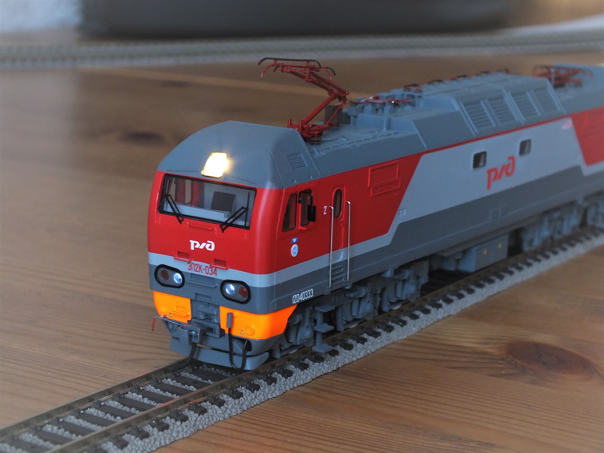 Электровоз ЭП2К-034 2009 года постройки. С завода поступил в депо ТЧЭ-8 Санкт-Петербург-Пассажирский-Московский. Модель выполнена в корпоративной окраске РЖД. На этот раз модель обмоторена, применена ходовая часть от AlexxLAB, свет по направлению движения, установлены кулачковые сцепки Kadee.